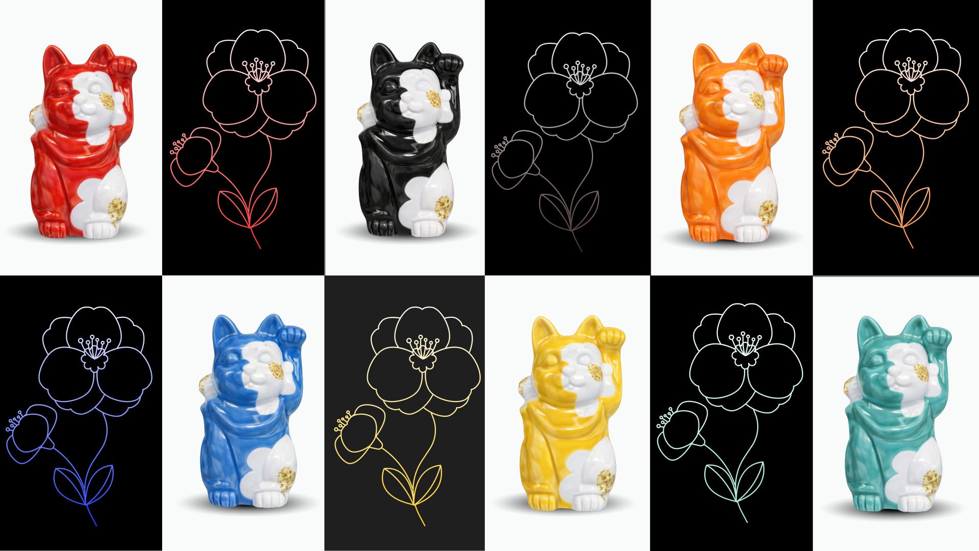 次世代の文脈において招き猫を再定義したい。その取り組みから生まれた招き猫オブジェ『ARTMANEKI TSUBAKI』は100年以上にわたって技を受け継いできた工房と対談し、相互理解を重ねながら政策を進めた作品です。