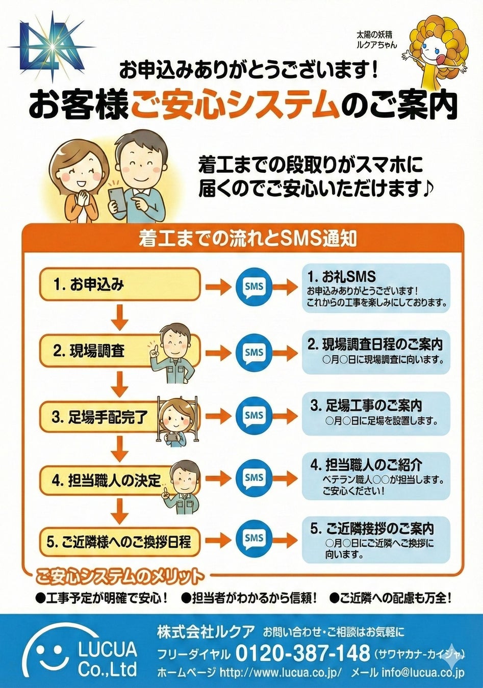 そこで、どなたでも手軽に確認できるSMSを活用し、工事の進捗状況や急な連絡をリアルタイムにお伝えする「ルクアお客様ご安心システム」を開発・導入いたしました。