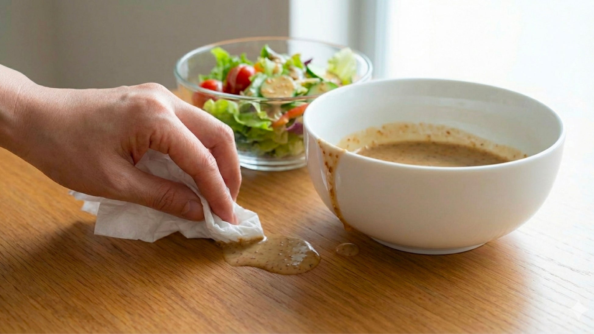 ドレッシングやソースを注ぐたびに、注ぎ口からツーっと伝った一筋の液体が器のフチやテーブルにぽたっと落ちる。気づけば、食事のたびにティッシュペーパーなどで拭くのが当たり前になっていませんか?テーブルやランチョンマットに、丸いシミがいくつも残ってしまう…。おもてなしの食卓なのに、ソースの輪ジミが目について残念…「まあ、仕方ないか」と毎回サッと拭いて終わらせているけれど、本当は