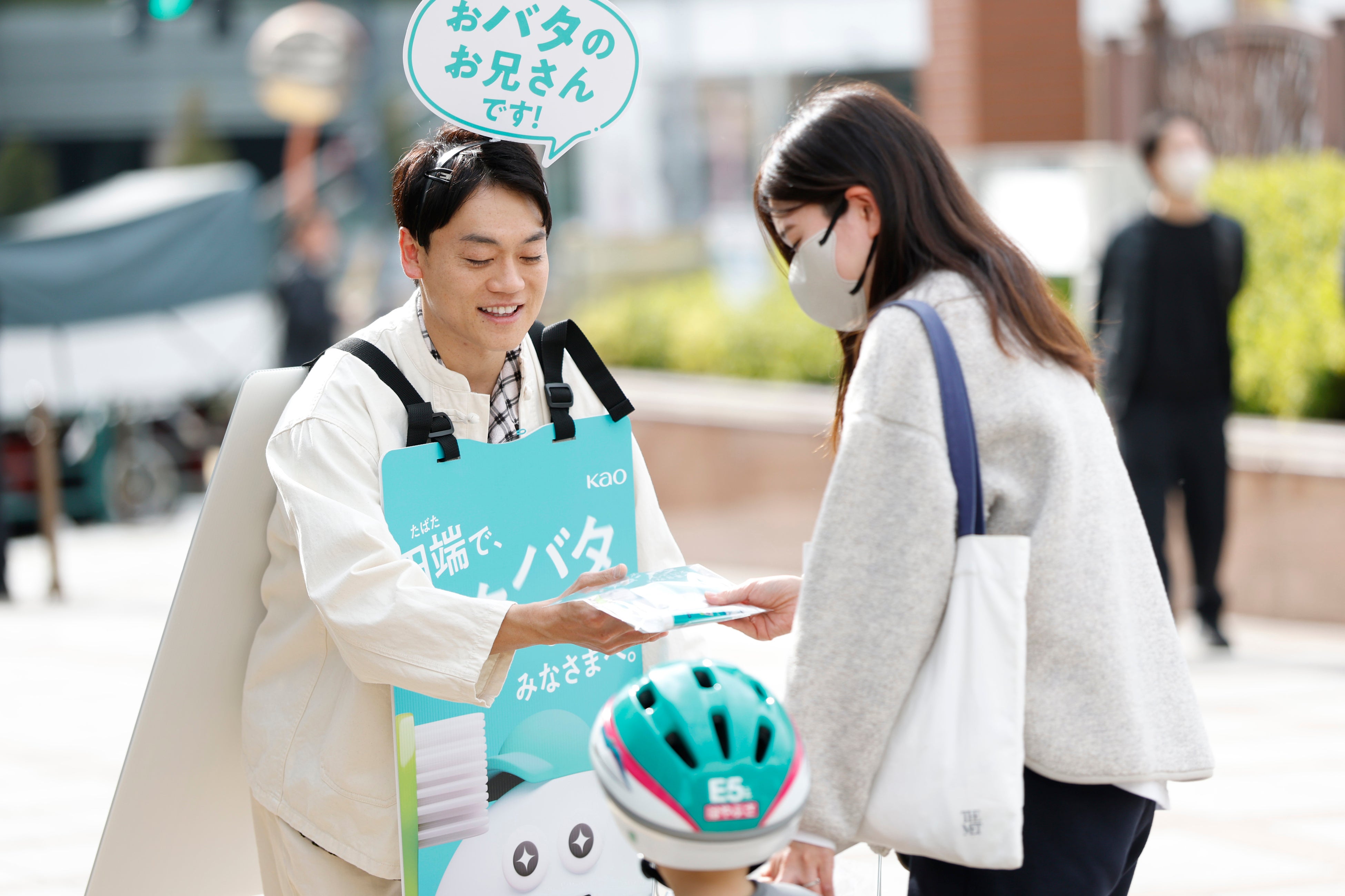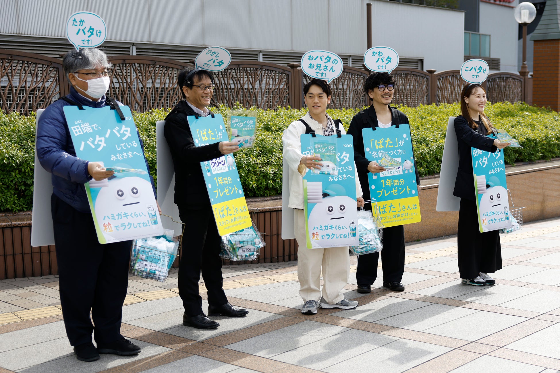 発表会終了後、おばたのお兄さんは田端(タバタ)駅周辺に移動し、「田端でバタバタしているみなさまへ。」「おばたのお兄さんが配布中」というサンドイッチ看板やカチューシャをつけながら、クリアクリーンNEXDENTの試供品を配布いたしました。「バタバタ磨きでも、粒でラクしてくださいね!」と声をかけながらサンプリング活動を行いました。名前に「バタ」がつく人には『クリアクリーンNEXDENT』1年分をプレゼントする特別企画も実施しています。このサンプリングキャンペーンは2月26日(木)まで田端駅周辺で実施される予定です。