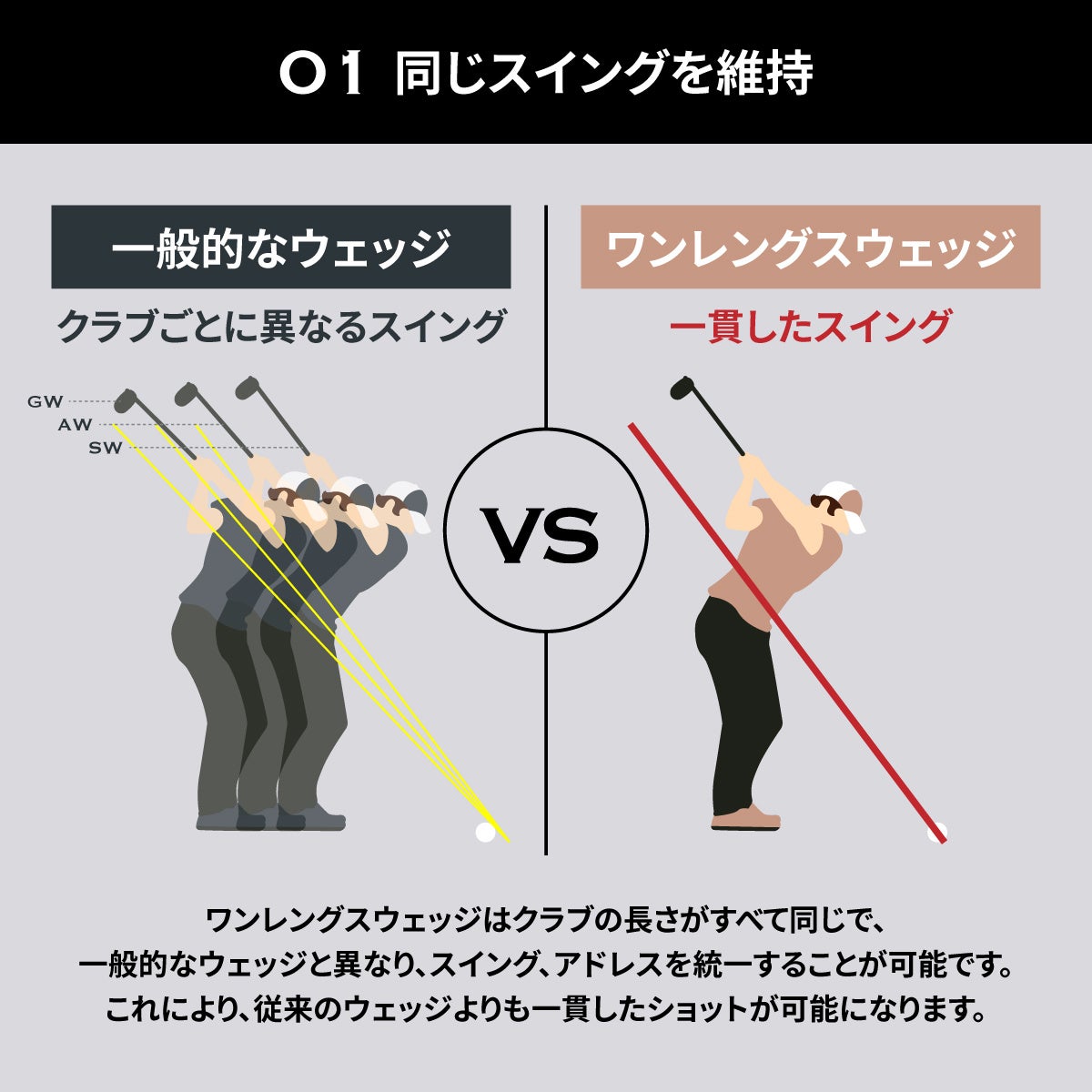 NOOGのワンレングスウェッジは同じ長さ・重さのため、すべての番手を同じスイングで打つことが出来ます。