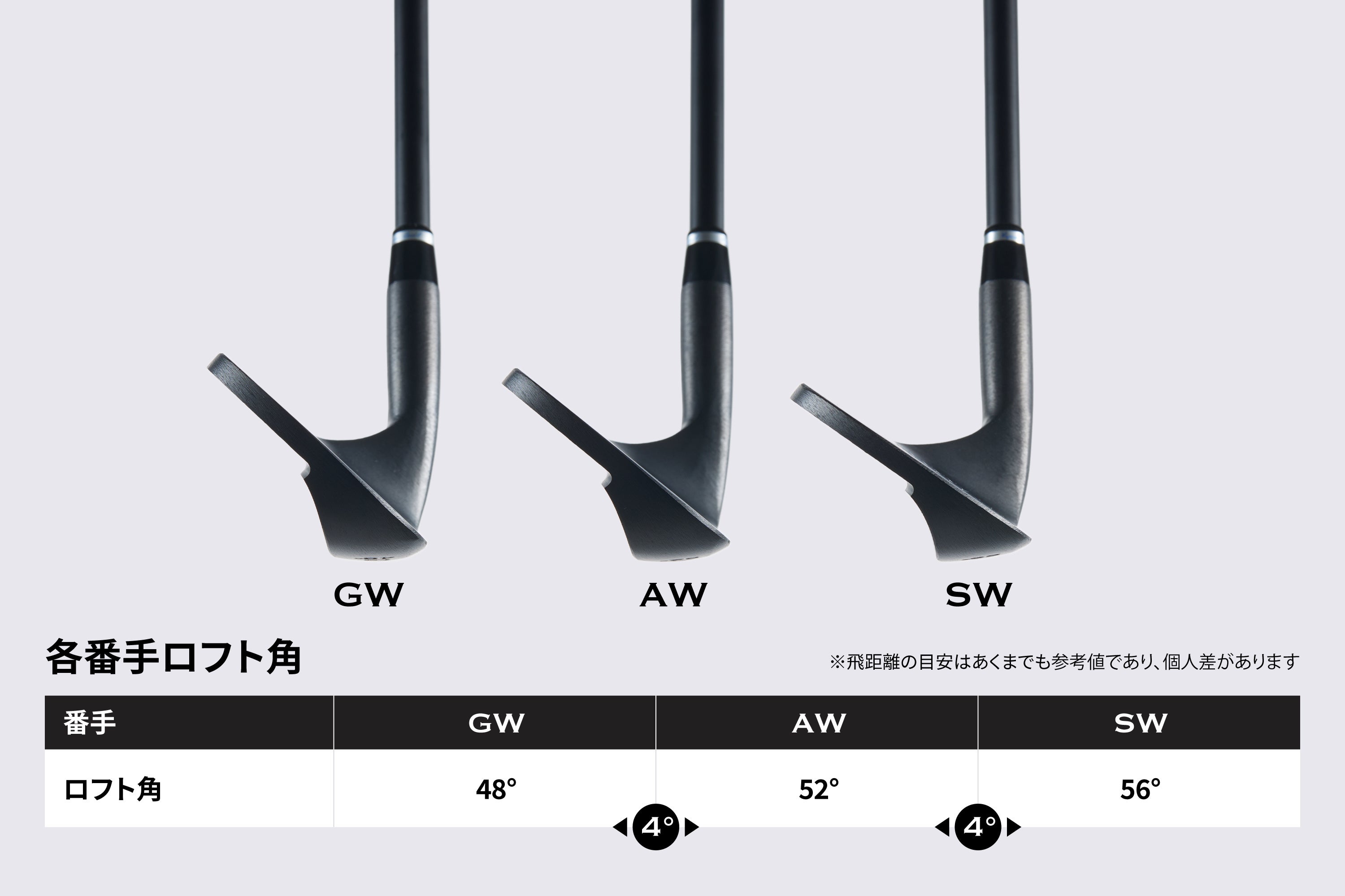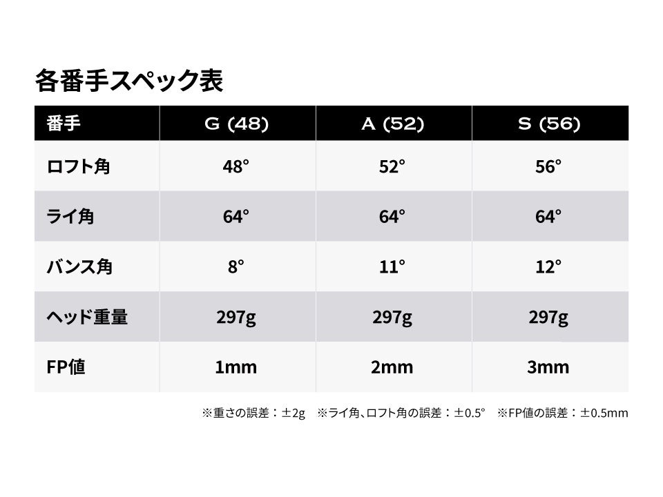 ギャップウェッジ(GW・48度)、アプローチウェッジ(AW・52度)、サンドウェッジ(SW・56度)の3番手すべてを、同一の長さ・重量で設計。長さは35.25インチ、ヘッド重量は297gに統一しています。