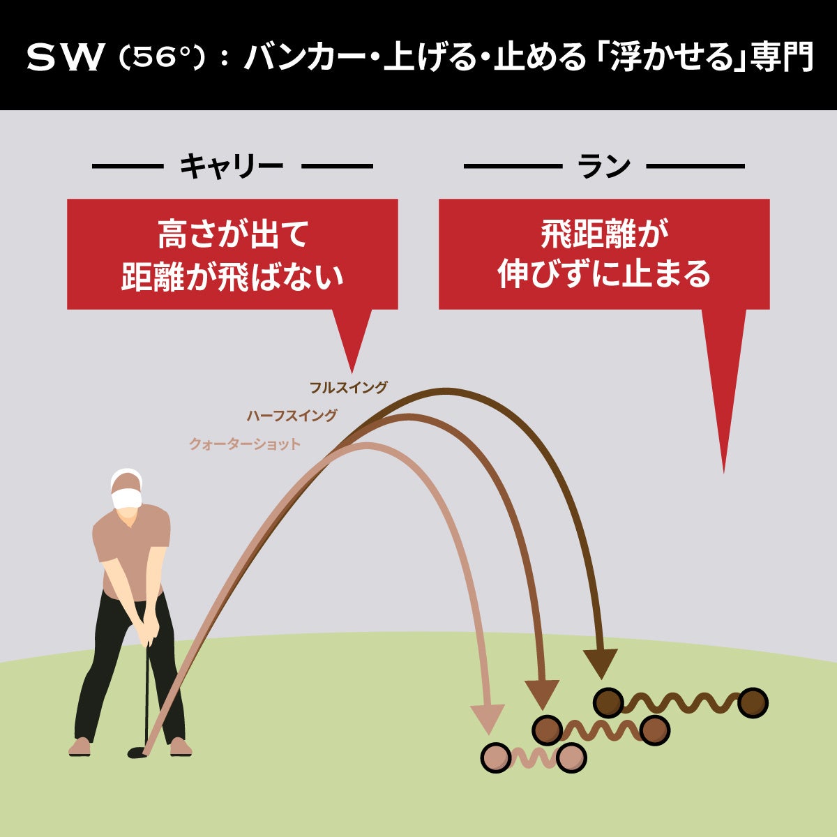 ウェッジを使用するにあたって、番手の使い分けがうまくできていない方が少なくありません。ウェッジを使用する100ヤード以内で、狙いに応じたアプローチショットを再現性高く打ち分けられるようになると、スコアの改善に繋がります。