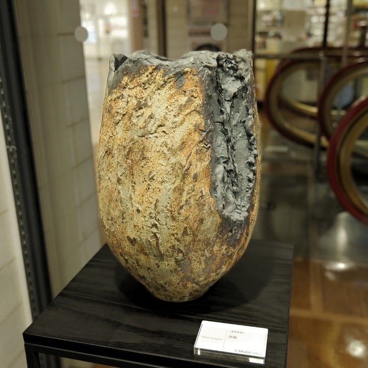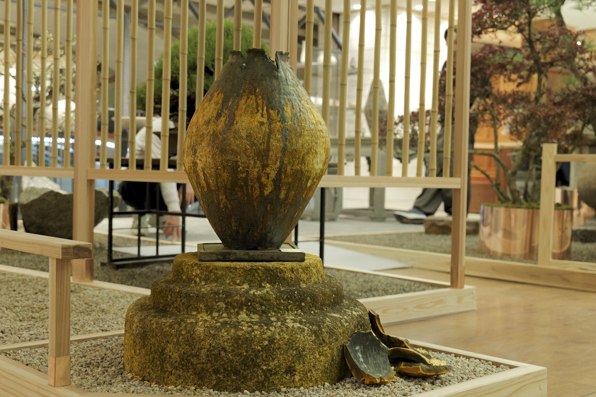 百貨店という屋内空間の中に、敷き庭や石組を基調とした自然の景色が現れ、その中に本展のために制作された一点物の器と、風格ある盆栽が配置されます。