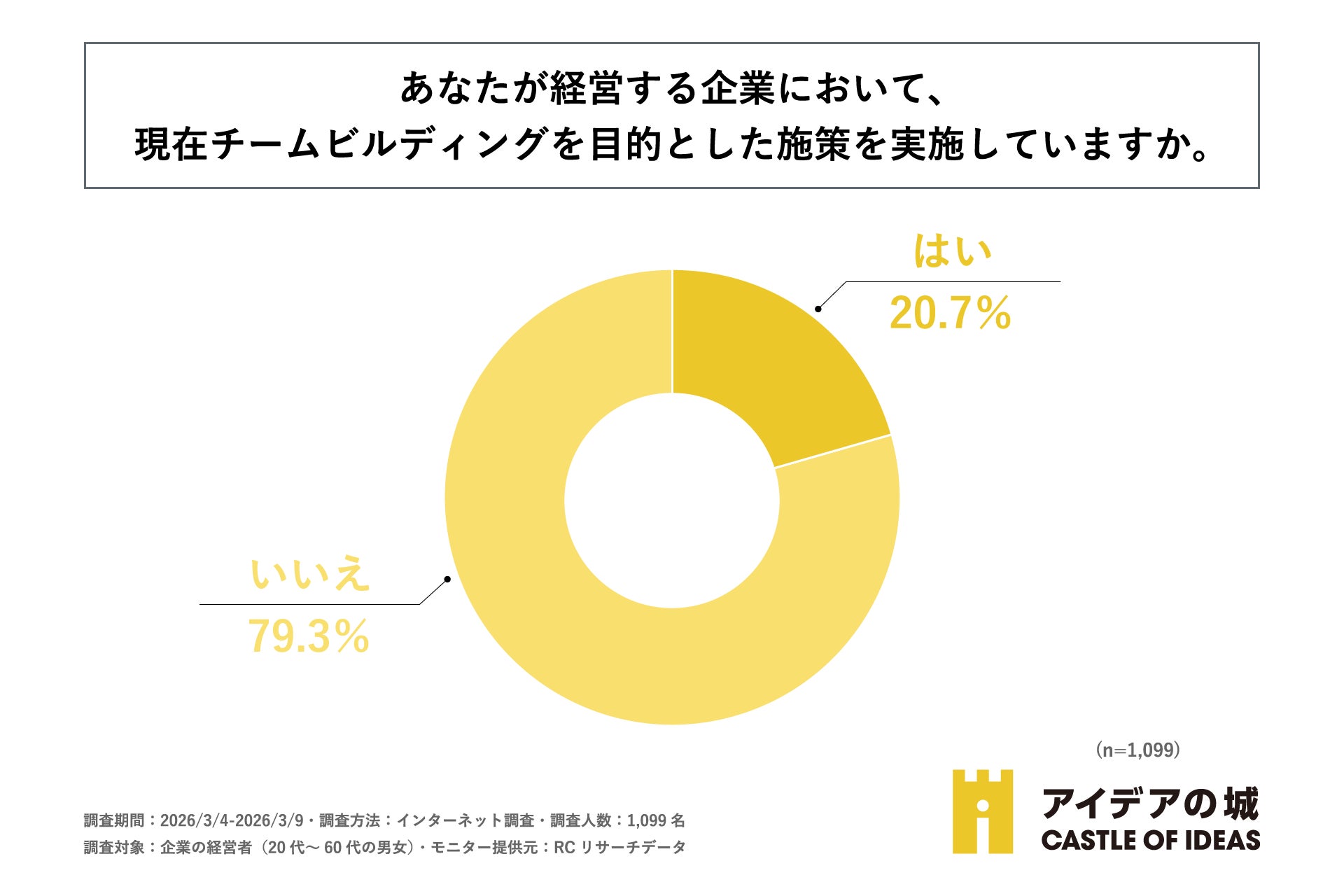 まず、「自身が経営する企業において、現在チームビルディングを目的とした施策を実施しているか」を尋ねる設問への回答では、「いいえ」が79.3%、「はい」が20.7%という結果になりました。この結果から、現在、自社でチームビルディングを目的とした施策を実施している企業は約2割に留まることがわかりました。