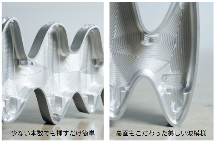 Alunamiは、精密な金型技術と再生アルミニウムによって生まれた、「飾る」と「生ける」を両立する新しいフラワーベースです。