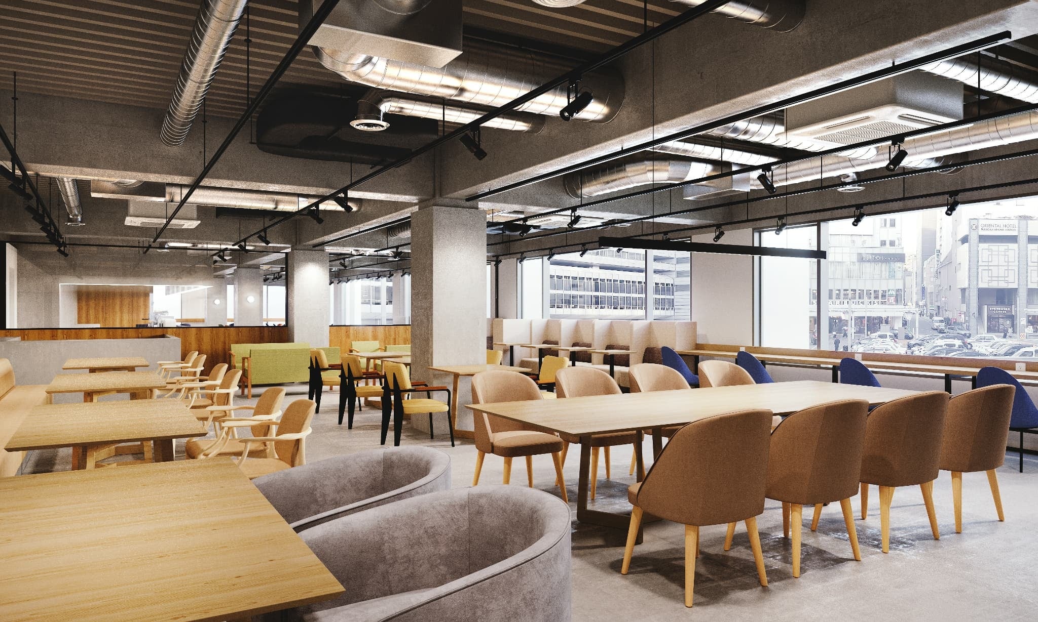 洗練されたデザインと機能的な設備 オフィスやラウンジでは集中力を高めるためのインテリアデザインに加え、高速Wi-Fi、各席電源、フリードリンク、複合機など、快適な執務環境を完備しています。