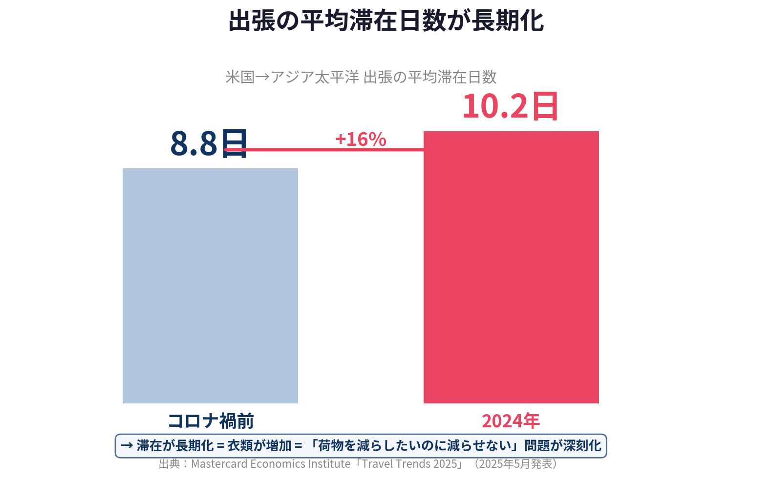 Mastercard経済研究所が2025年5月に発表した「Travel Trends 2025」によると、米国からアジア太平洋地域への出張は、平均滞在日数がコロナ禍前の8.8日から10.2日へと延びています。出張回数は減少する一方、1回あたりの滞在期間は長期化しており、必要な衣類の量も増加。「荷物を減らしたいのに減らせない」矛盾がビジネスパーソンを悩ませています。