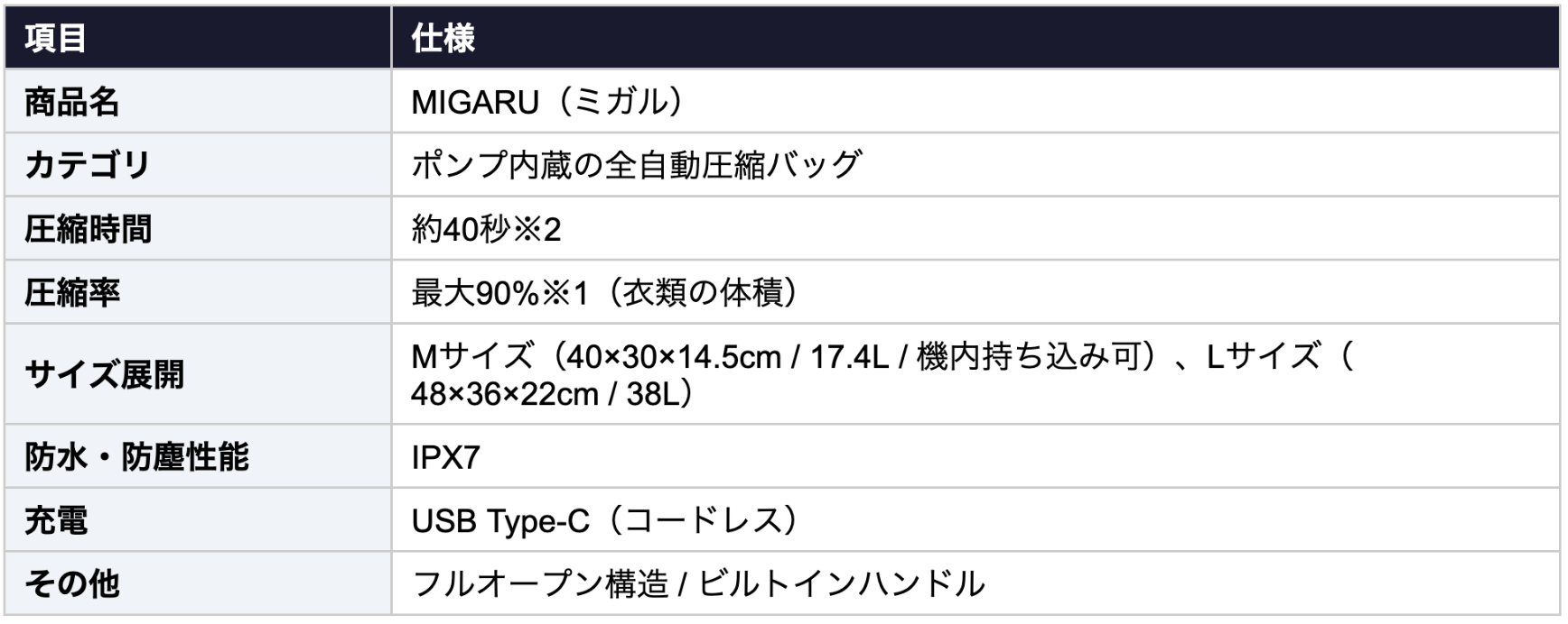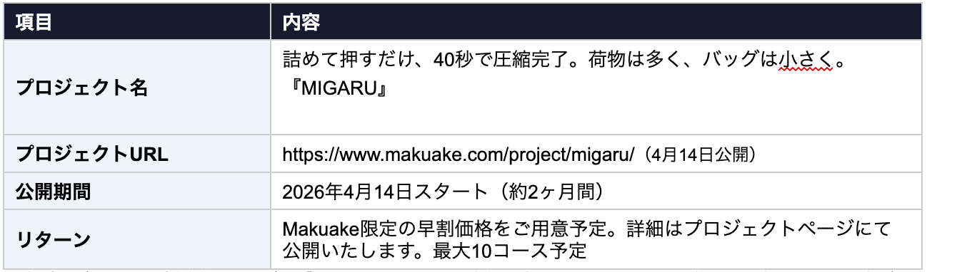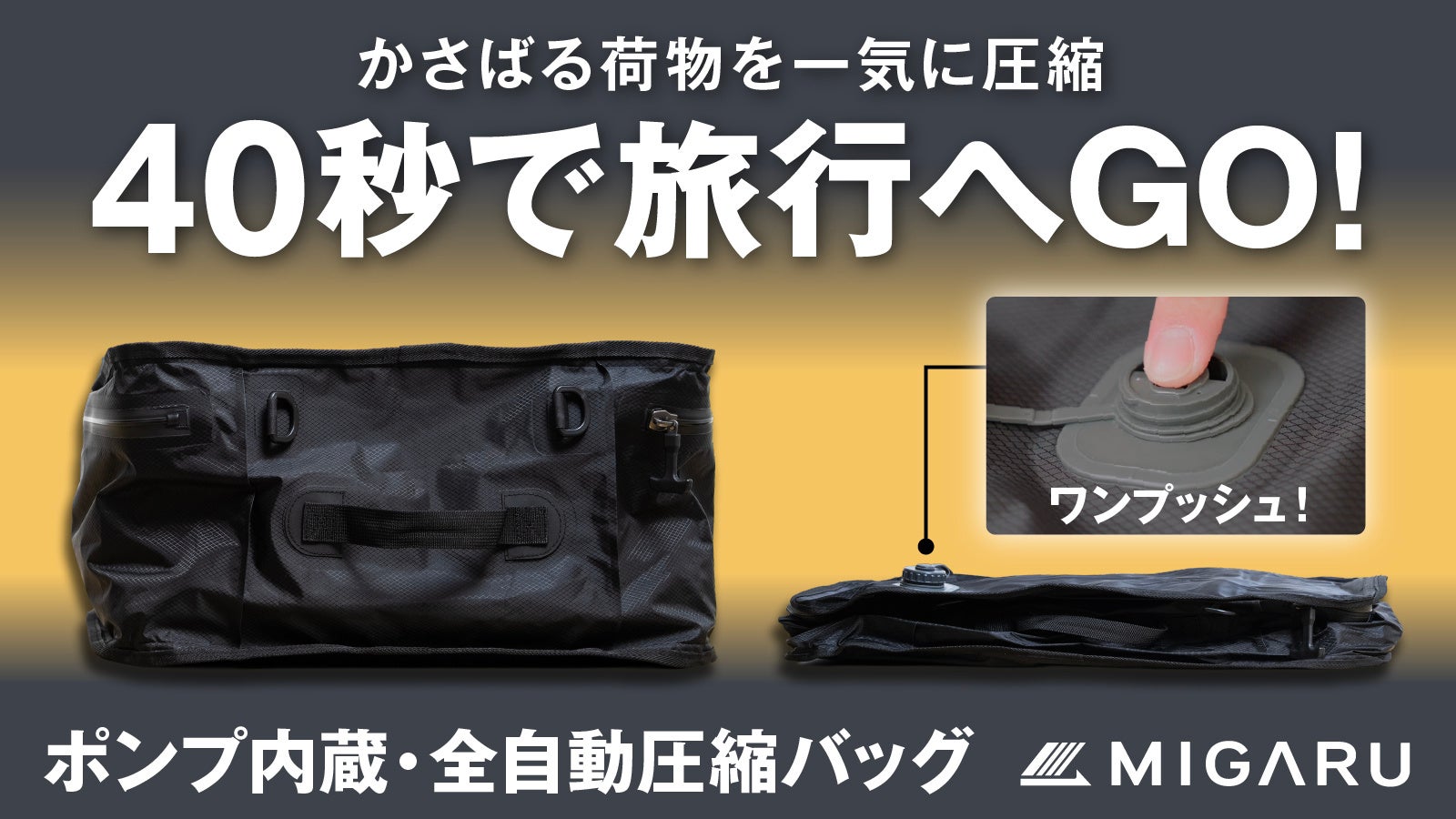 合同会社onigiri(所在地:東京都渋谷区恵比寿西、代表社員:青木真美)は、ポンプを内蔵しボタンひとつで衣類を自動圧縮する新発想のバッグ『MIGARU(ミガル)』を、応援購入サービス「Makuake」にて2026年4月14日より先行販売を開始いたします。コロナ後の旅行需要回復と出張の長期化により深刻化する「荷物問題」に対し、衣類の体積を最大90%カット※1することで、パッキングの概念を根本から変える製品です。
