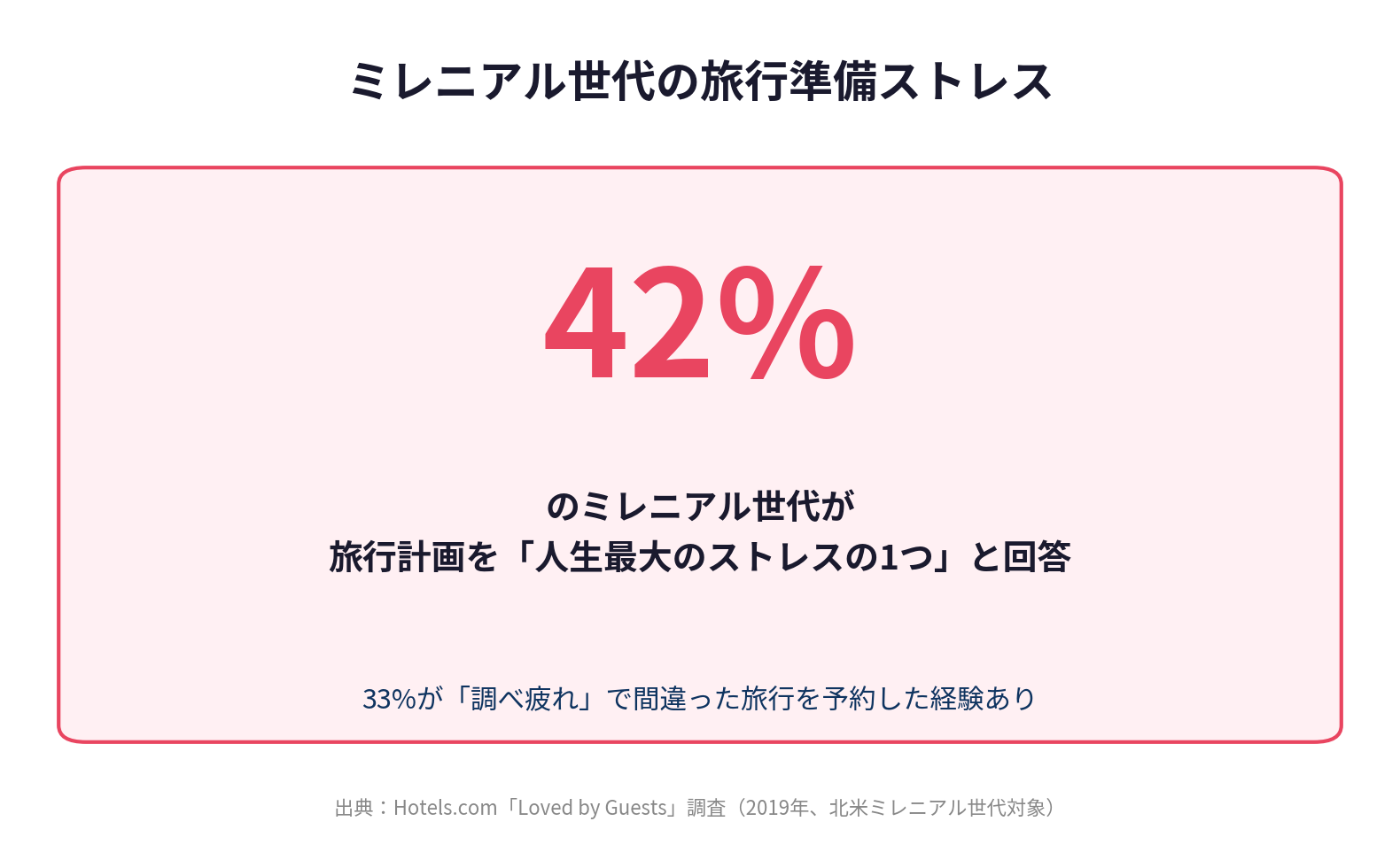 Hotels.comが2019年に発表した「Net Lag Survey」(One Poll社実施、26カ国7,800名対象)によると、ミレニアル世代の旅行者のうち42%が、旅行の計画やリサーチを「人生最大のストレスの1つ」と回答。さらに33%が「調べ疲れ」から間違った旅行を予約してしまった経験があると回答しています。旅行準備のストレスは、世代を超えて深刻な課題です。