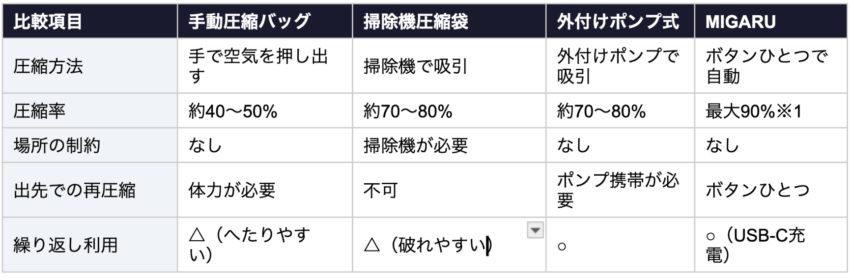 ※1 Tシャツ(綿100%)5枚をMサイズで圧縮した場合の自社測定値。衣類の種類・素材により異なります。