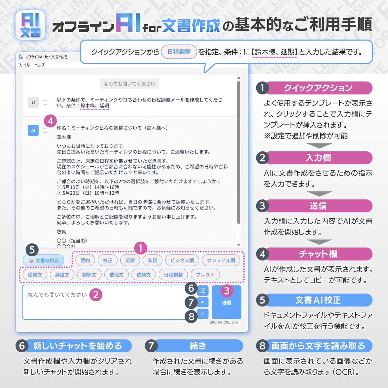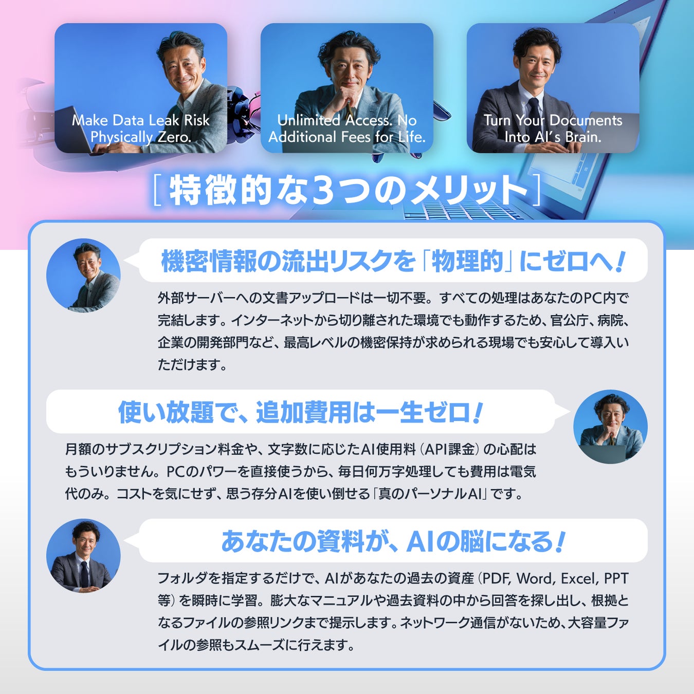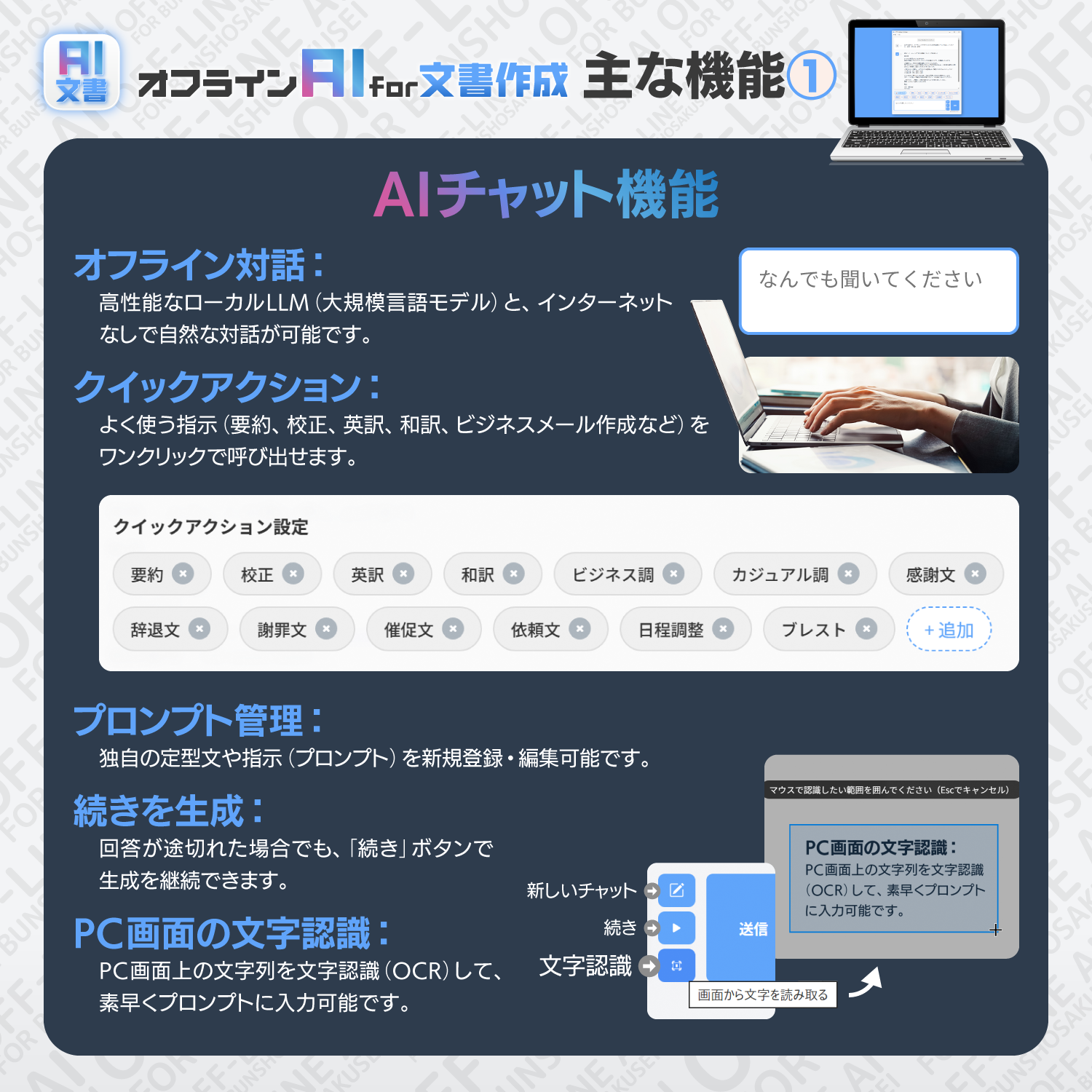 本製品は、要約・校正・翻訳・メール作成・社内文書検索をAIが支援しながら、すべての処理をPC内で完結する完全オフライン型ローカルAIソフトです。