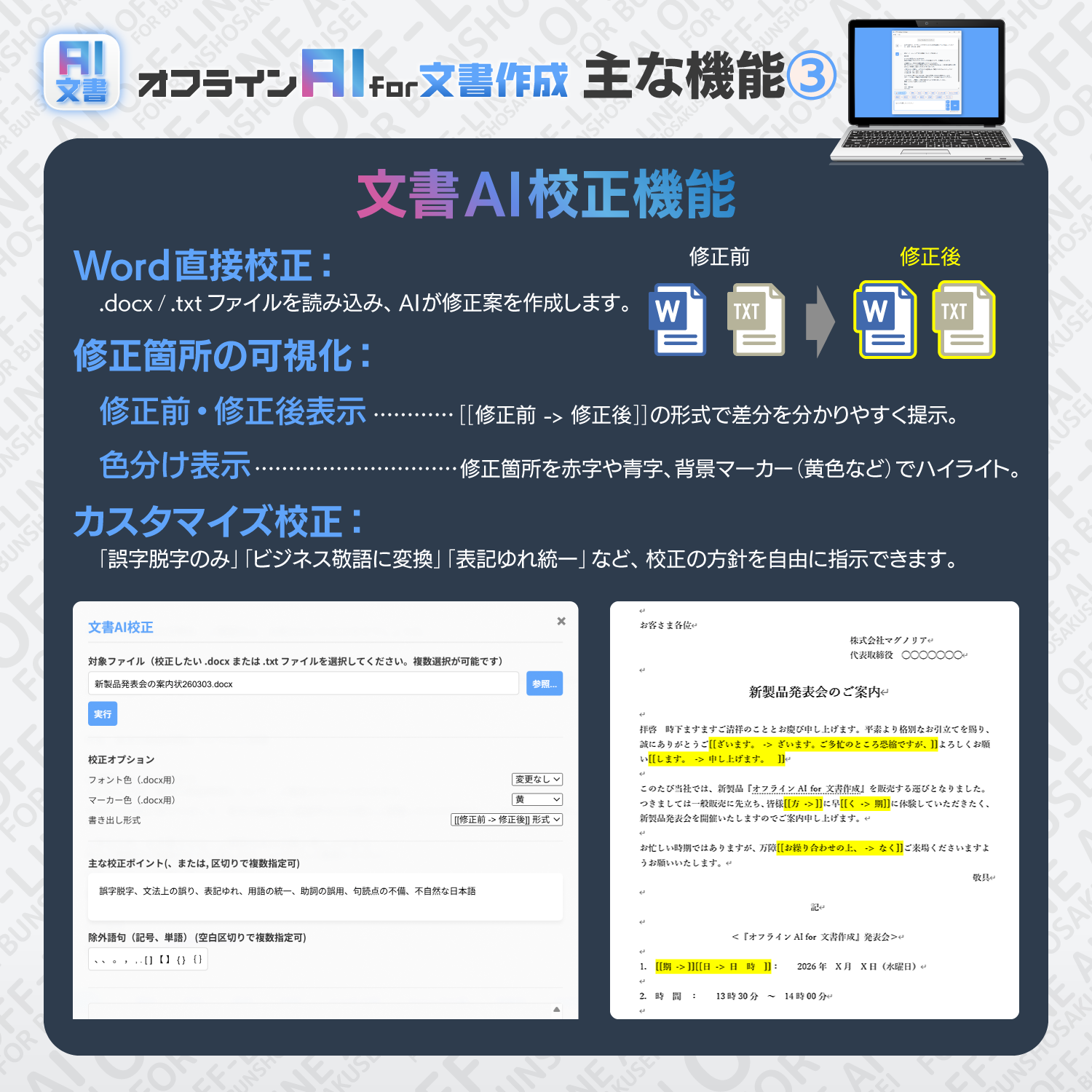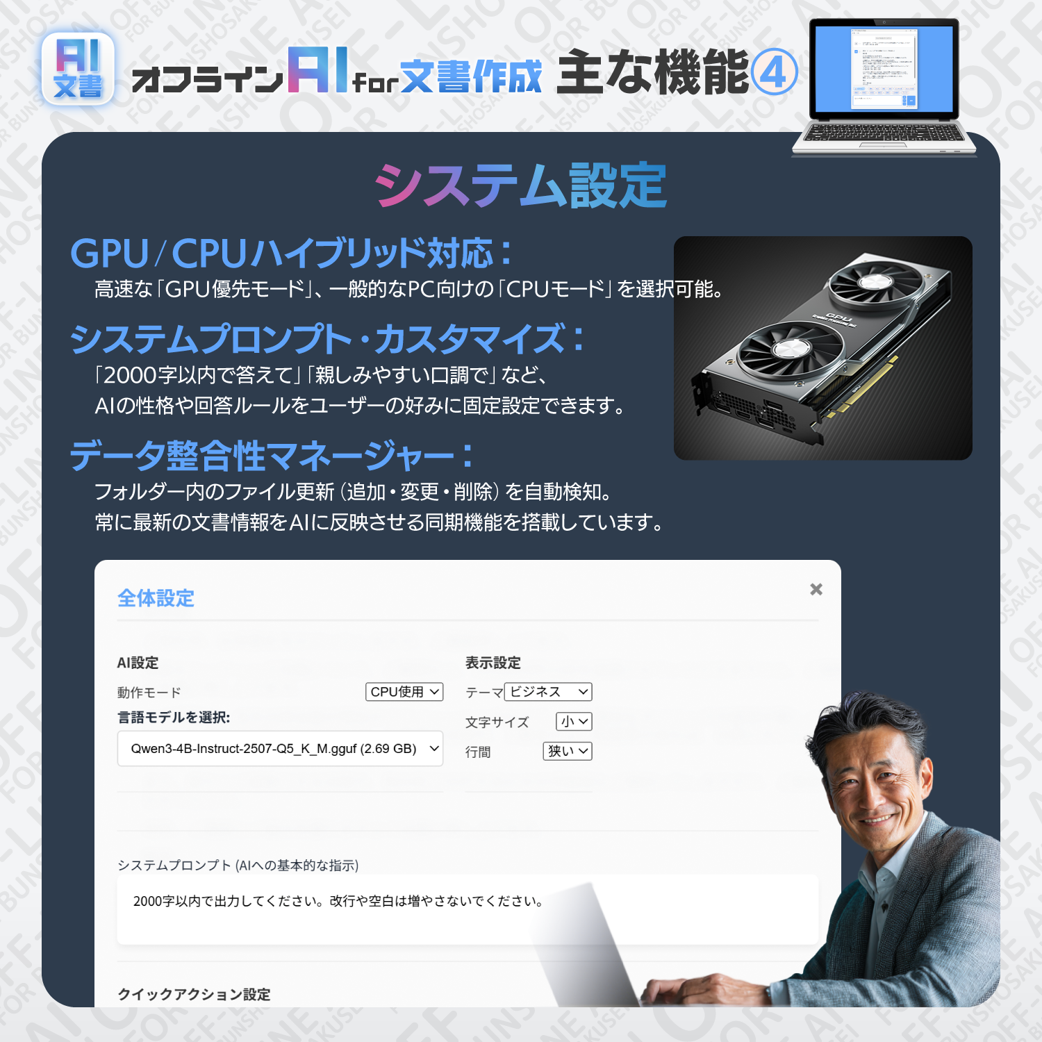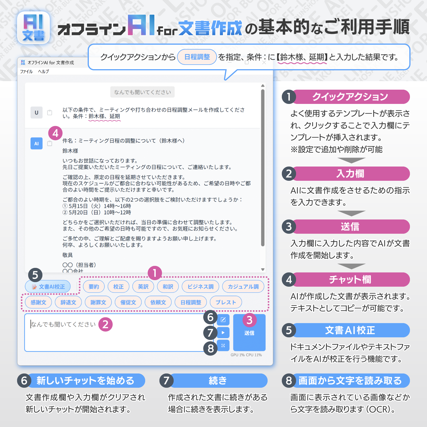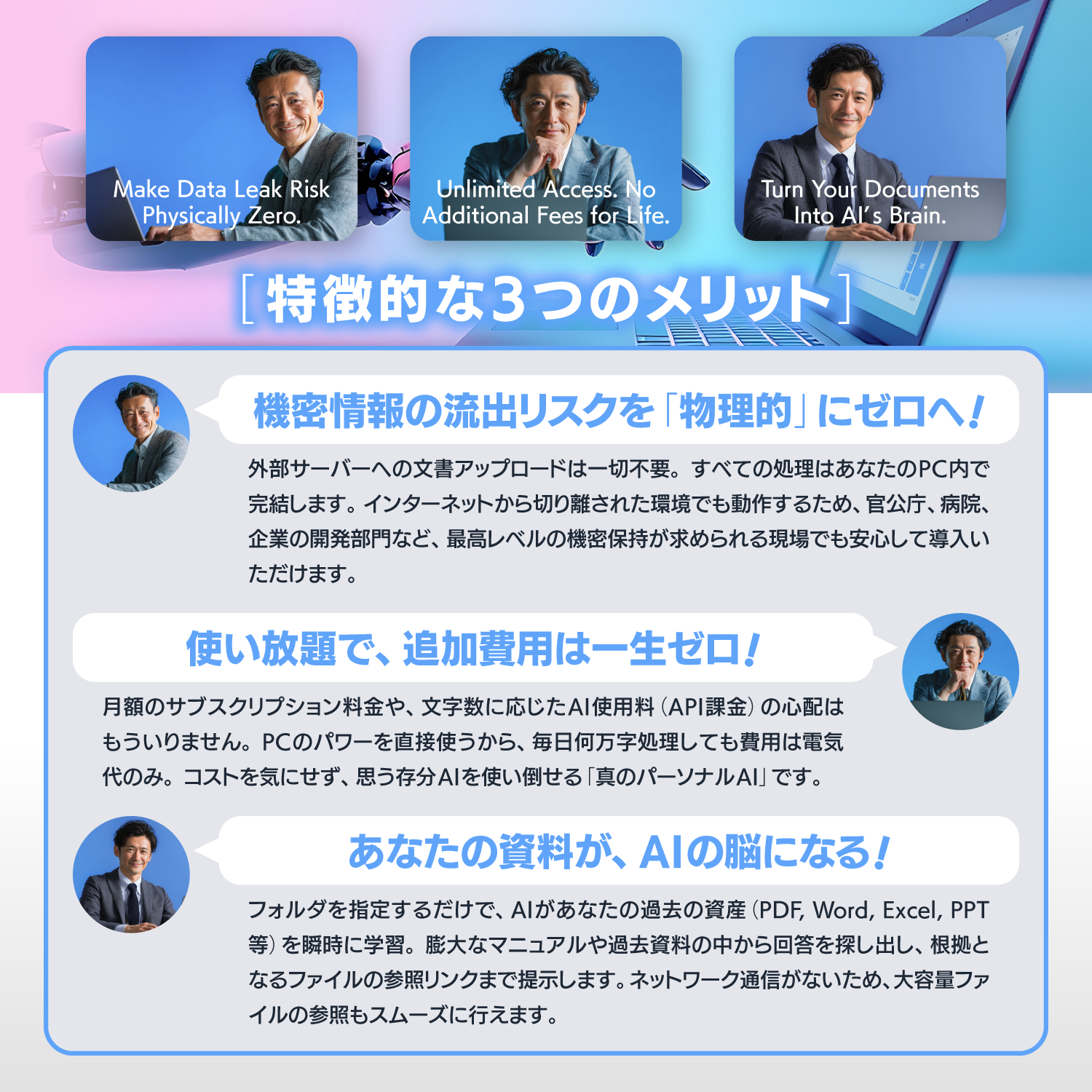 本製品は、要約・校正・翻訳・メール作成・社内文書検索をAIが支援しながら、すべての処理をPC内で完結する完全オフライン型ローカルAIソフトです。