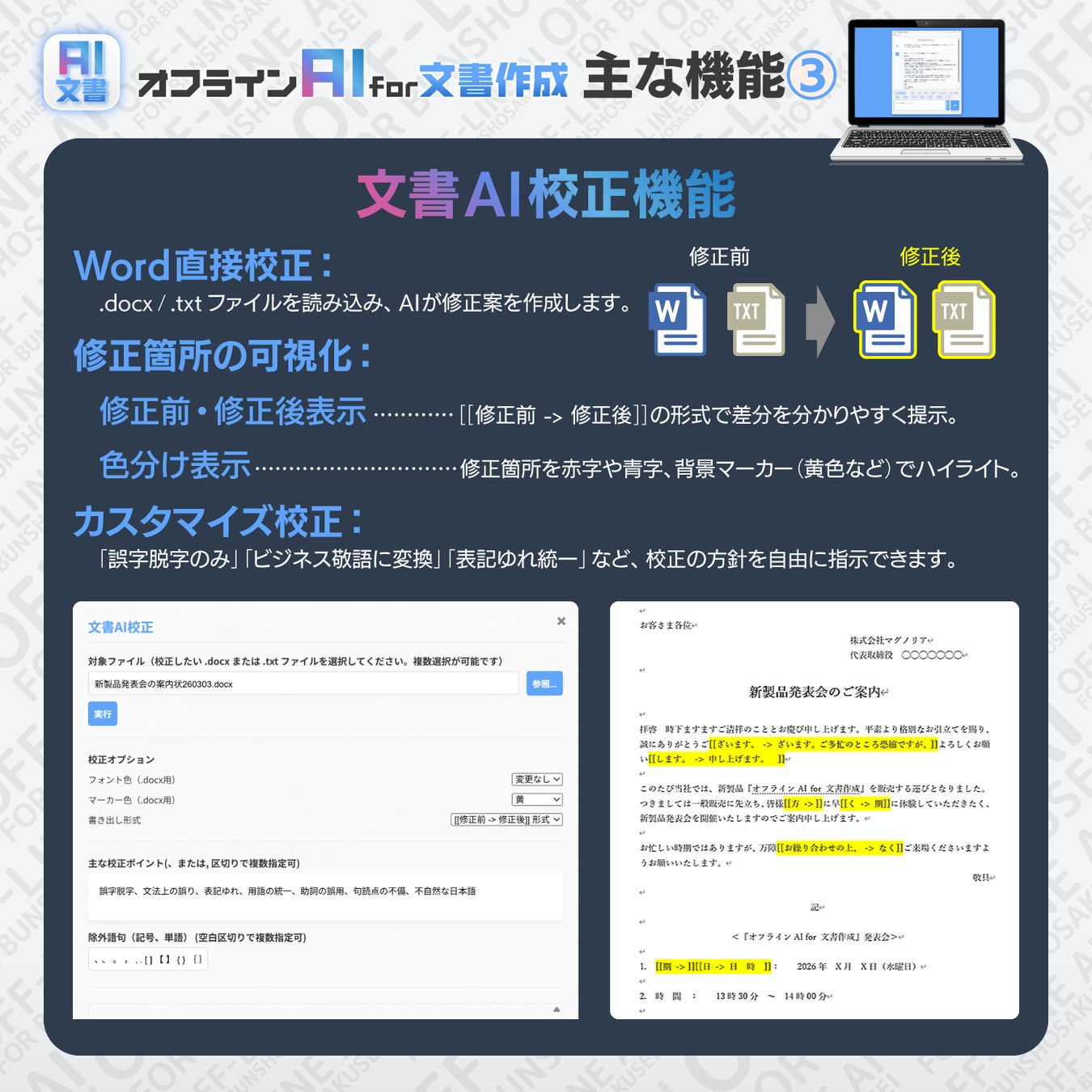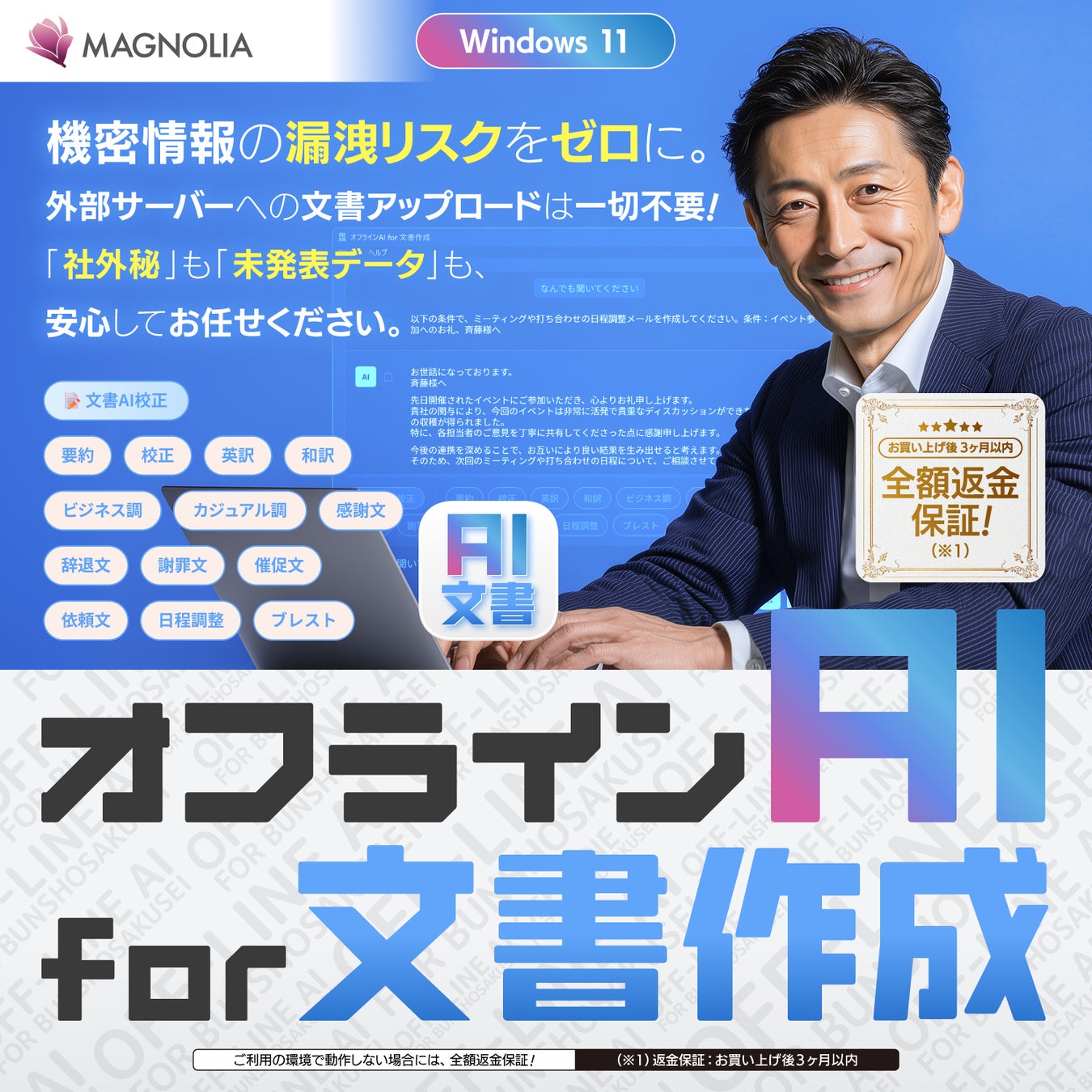 株式会社マグノリア(本社:名古屋市東区)は、インターネット接続不要で利用できるWindows向け生成AIソフト「オフラインAI for 文書作成」 を発売いたしました。