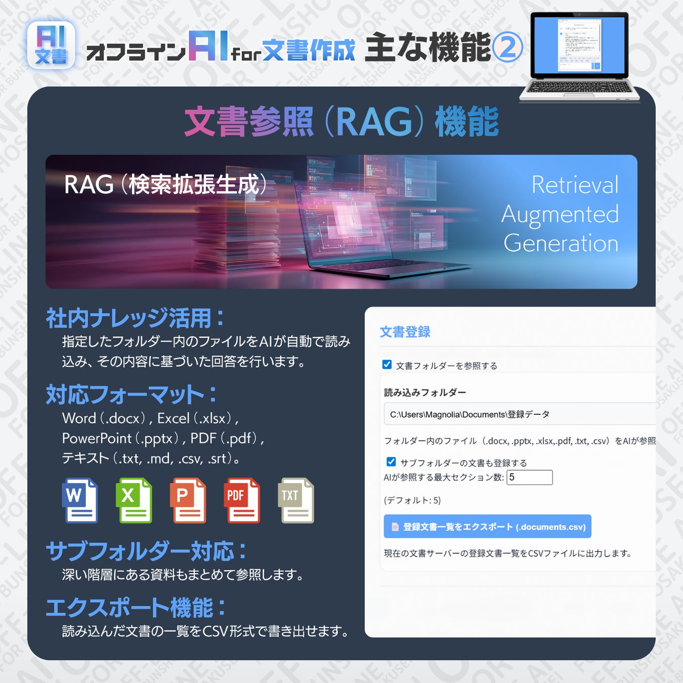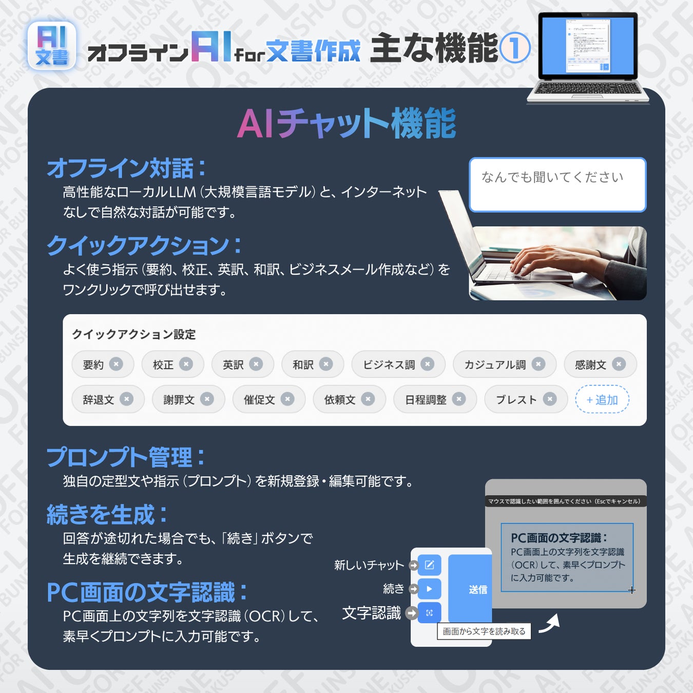 「オフラインAI for 文書作成」は、こうした課題を解決するため、ローカル環境のみで完結する生成AIソフトとして開発されました。