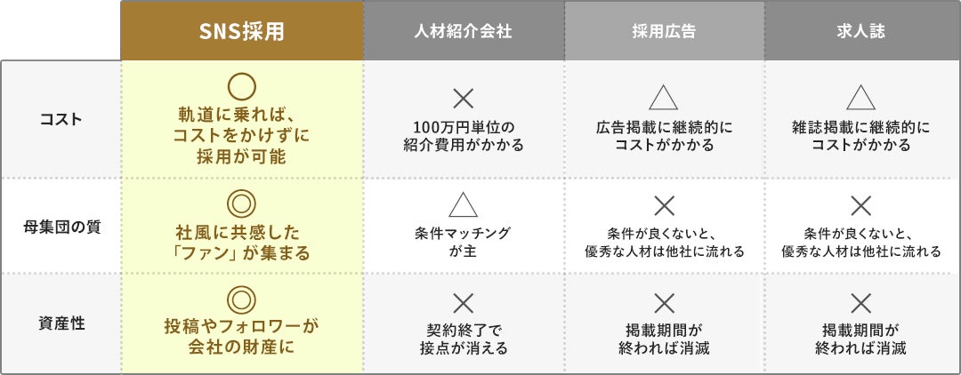 SNS採用は、従来の採用手法に比べて圧倒的にコストパフォーマンスに優れています。