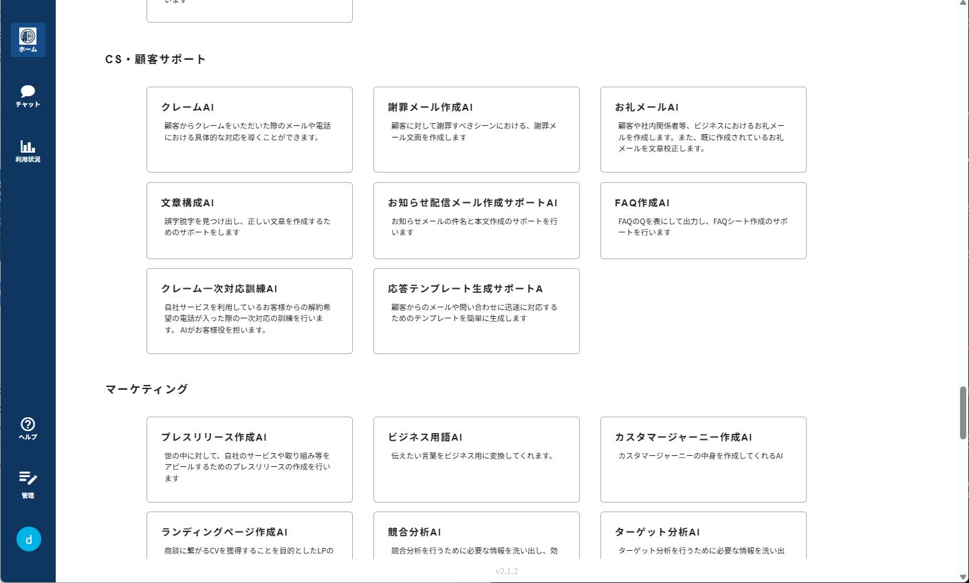 クレーム対応、議事録作成、理事会資料、法令チェックなど、実務別のAIチャットを標準搭載。導入初日から即活用可能です。