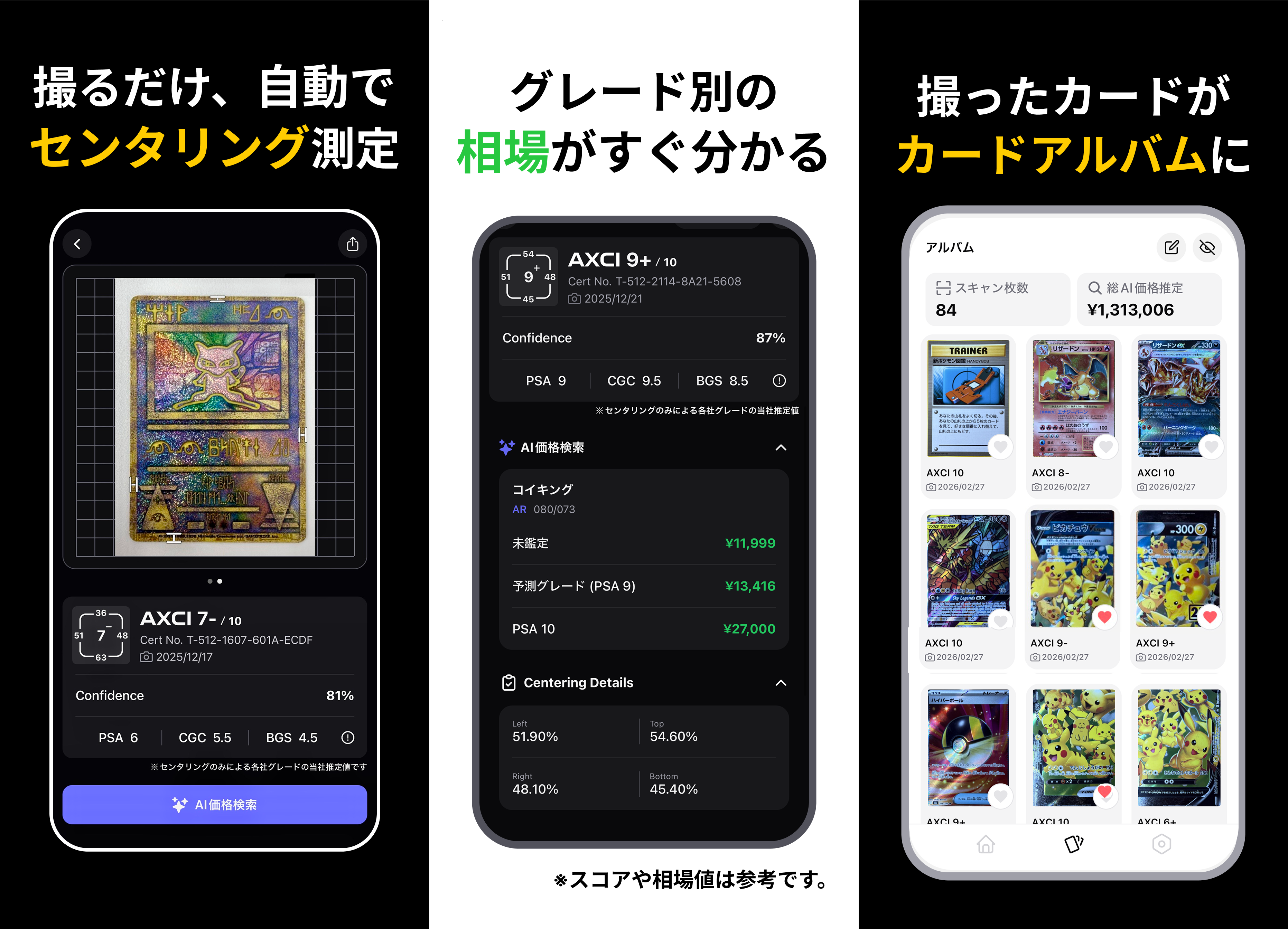 即時性:撮影後すぐにセンタリングスコアと価格目安を確認可能