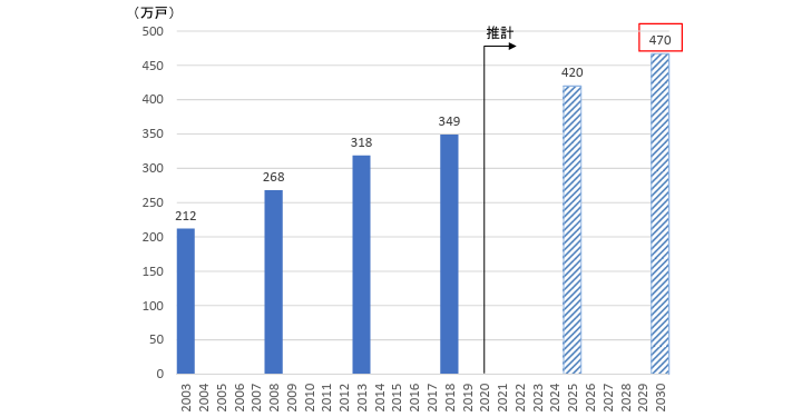 国土交通省『空き家政策の現状と課題及び検討の方向性』では、将来推計と増加抑制のまとめに、「その他空き家数の将来推計について、直近のトレンドによると、2025年(令和7年)で420万戸、次期住生活基本計画の成果指標目標年となる2030年(令和12)で470万戸程度と推計。」