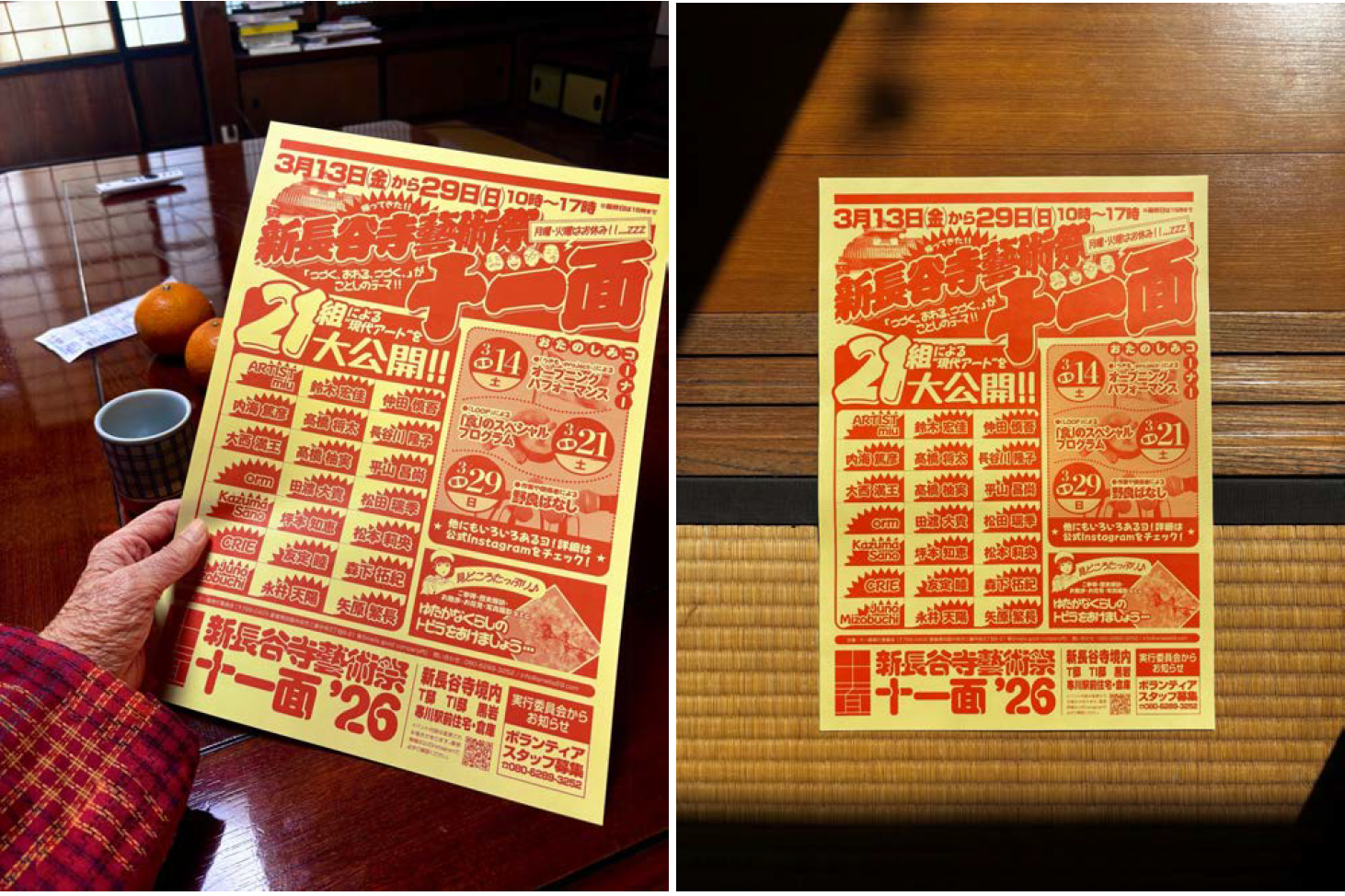 こうした背景を踏まえ、本年のキービジュアルでは「町への身近さ」と「批評性」をどのように両立できるかを主題としています。その試みの一つとして、あえて強くデザインされた美術展のビジュアルではなく、市民の多くにとって目馴染みのある1色刷りのスーパーのチラシをモチーフに採用しました。日常の中に自然に紛れ込み、当たり前のように掲示・配布されることで、芸術祭が町の風景の一部として立ち上がることを意図しています。