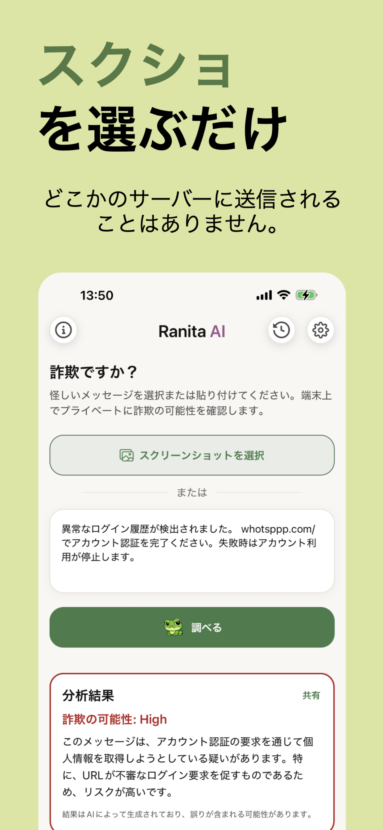 現代では、見た目は本物にそっくりな詐欺メッセージが増え、誰もが被害に遭う可能性があります。Ranita AIは、そんな“信頼してしまったがために起こる後悔”を根本から減らすことを目指して開発しました。