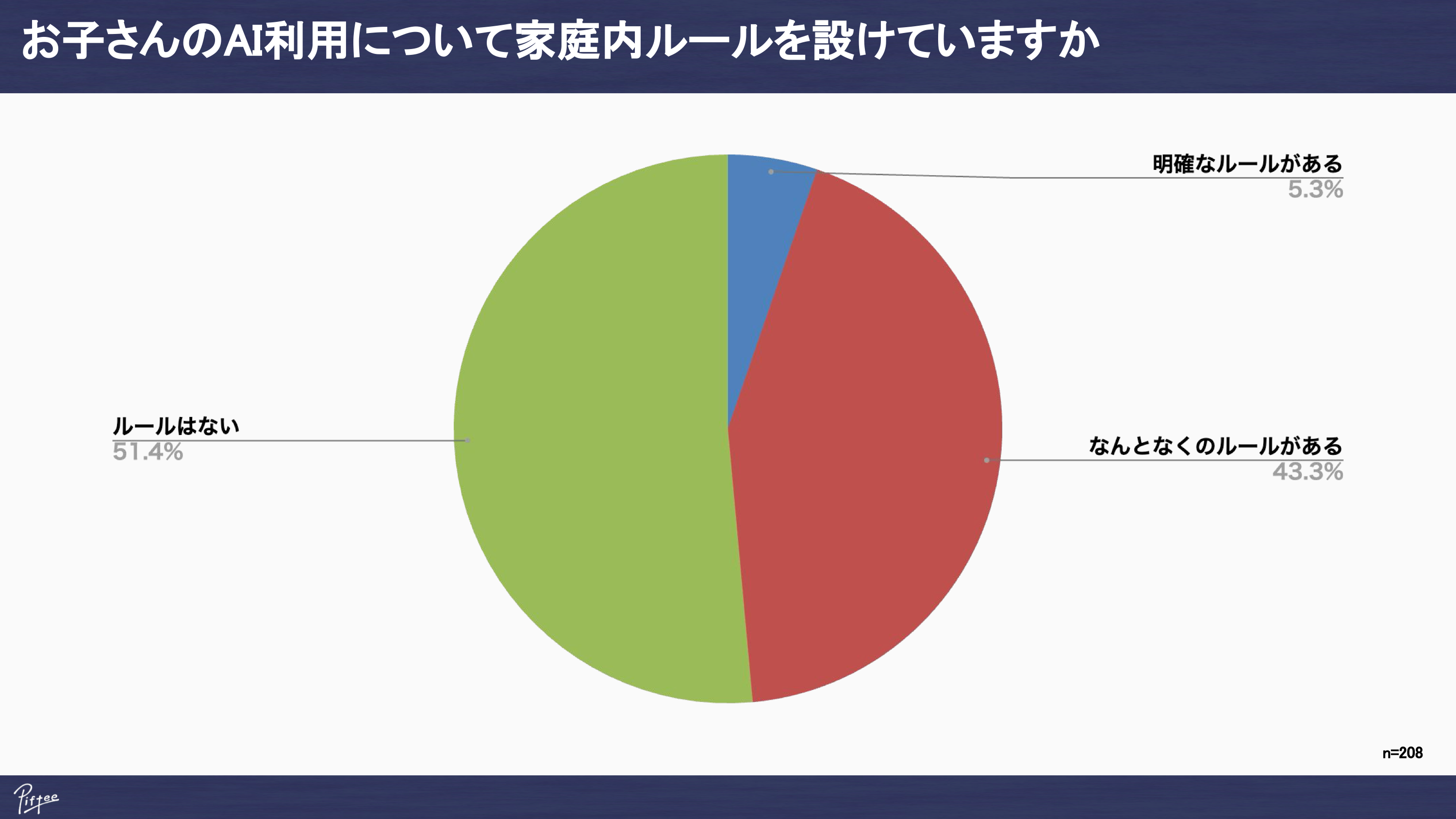 しかし、AI利用についての家庭内ルールを問うと、「ルールはない」が51.4%と過半数を占め、「明確なルールがある」と回答した家庭はわずか5.3%にとどまりました。不安を感じつつもルール整備が追いついていない「対策の空白地帯」が存在します。