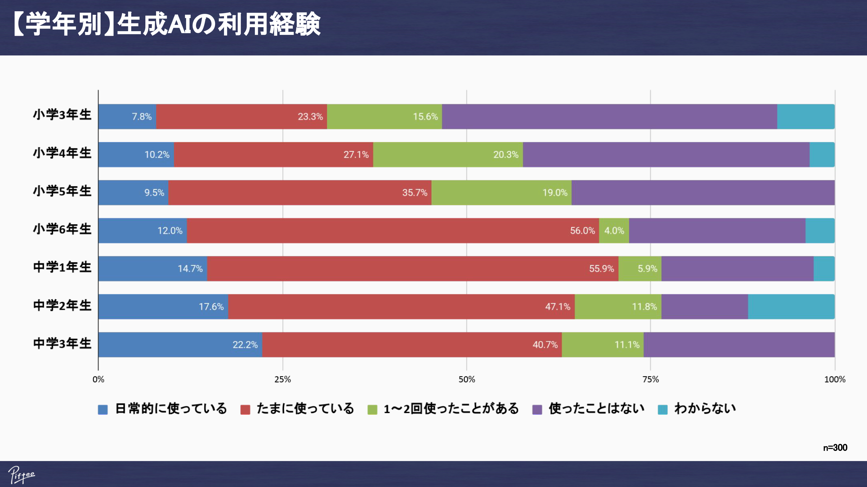 1. 小中学生の61.2%が生成AI(ChatGPT等)の利用経験あり。11.6%が「日常的に使っている」