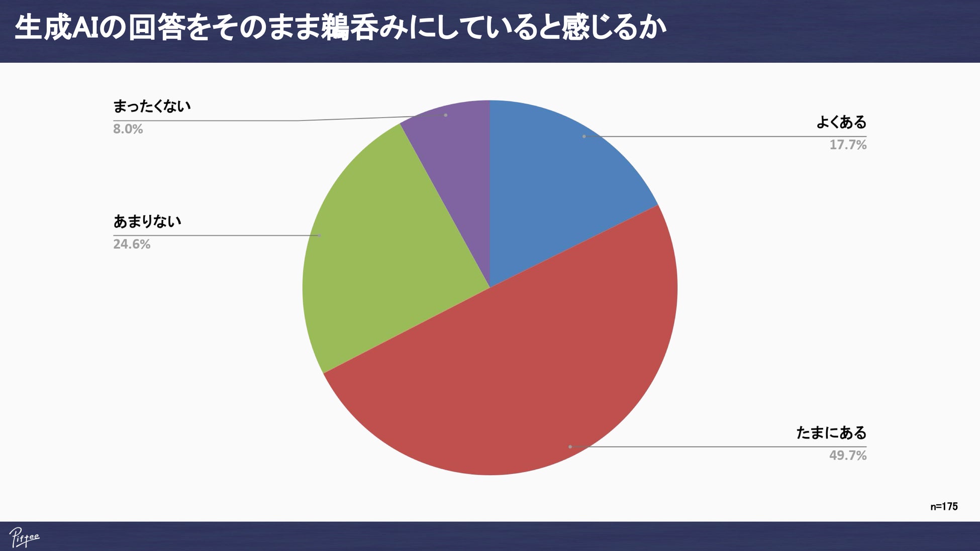 生成AI利用経験のある子供(175名)の保護者に限定すると、67.4%が「AIの回答をそのまま鵜呑みにしていると感じたことがある」(「よくある」+「たまにある」の合計)と回答しました。