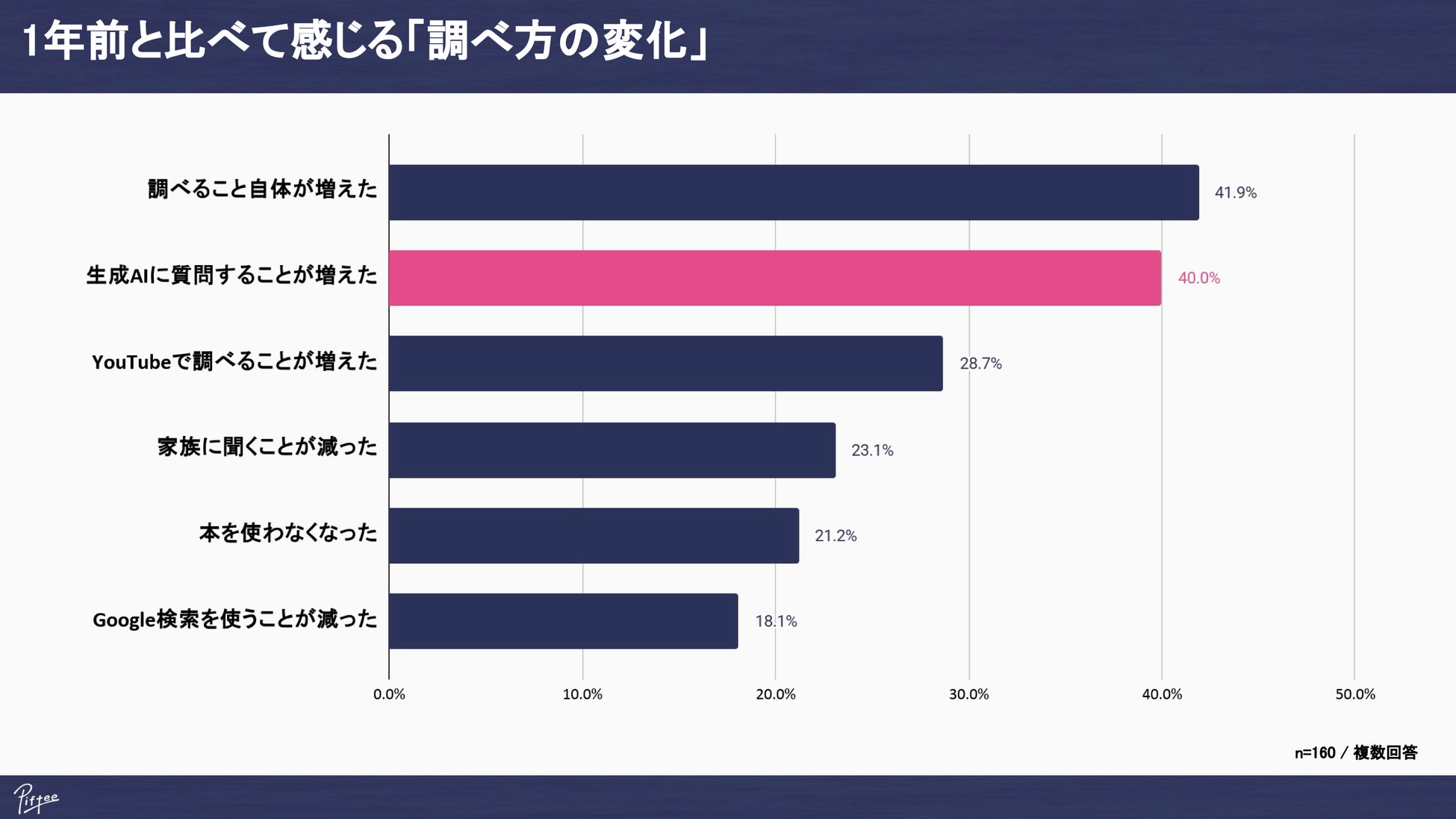 変化の内容(複数回答)では、「生成AIに質問することが増えた」(40.0%)、「YouTubeで調べることが増えた」(28.7%)、「家族に聞くことが減った」(23.1%)、「本を使わなくなった」(21.2%)と、デジタルツールへの移行を示す回答が上位に並びました。