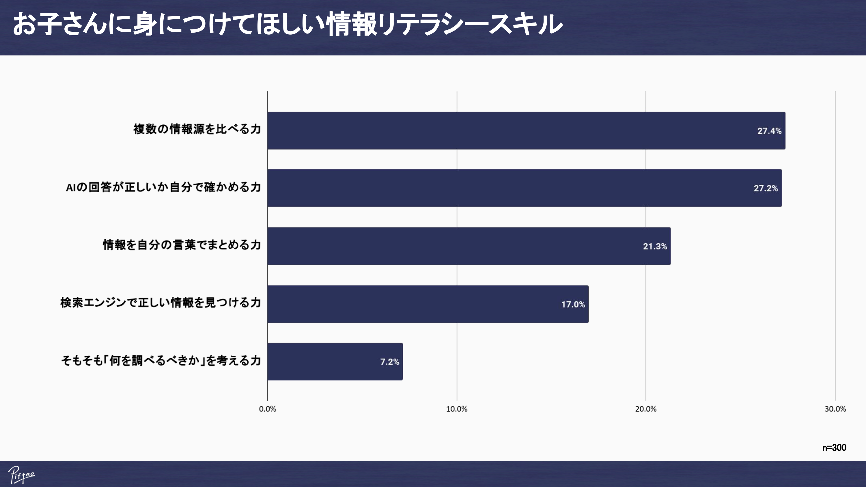 従来型の「検索エンジンで正しい情報を見つける力」(17.0%)を約10ポイント上回っており、保護者の意識が「いかに検索するか」から「いかにAIの回答を検証するか」へと移り変わりつつあることが示唆されます