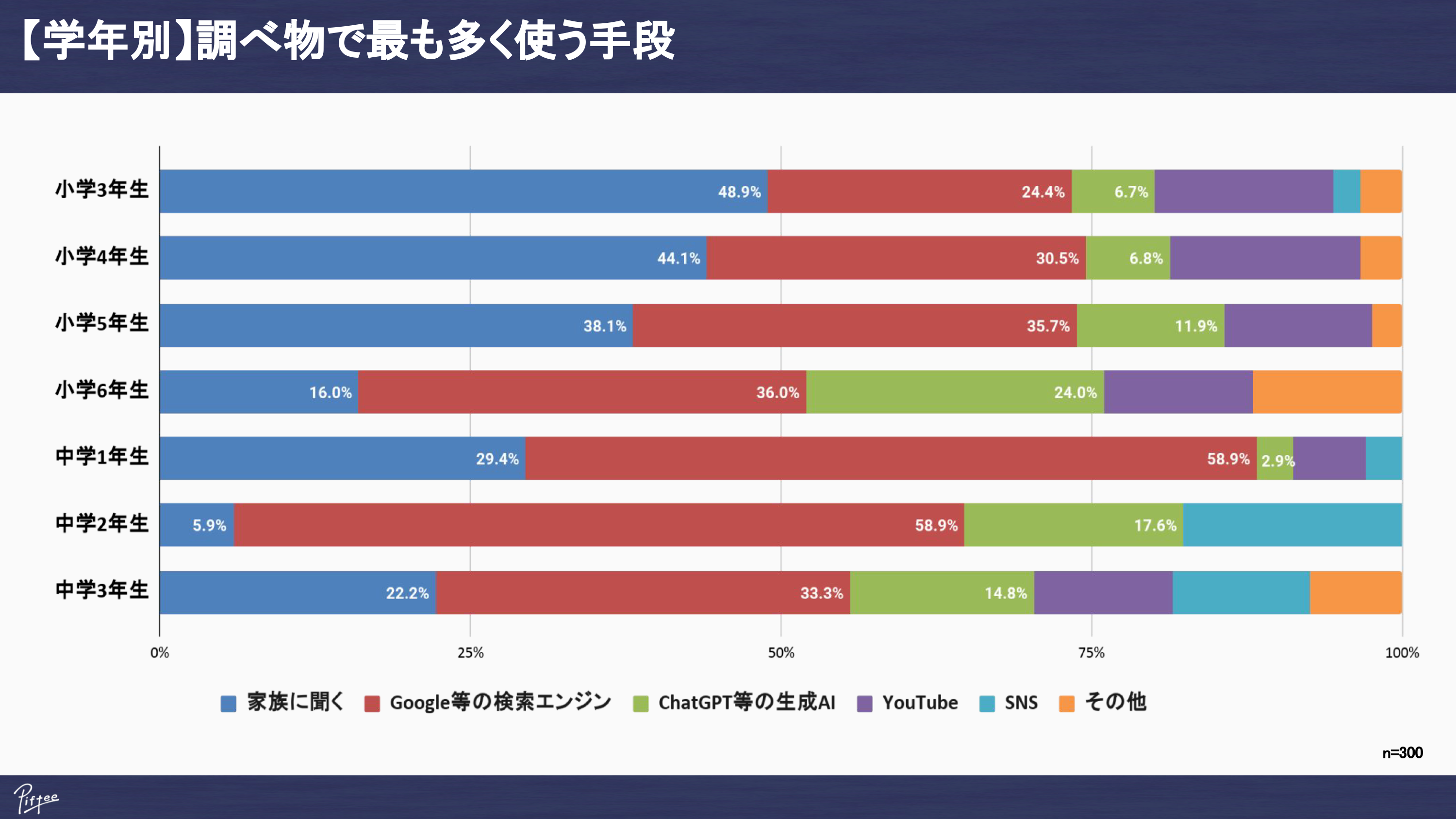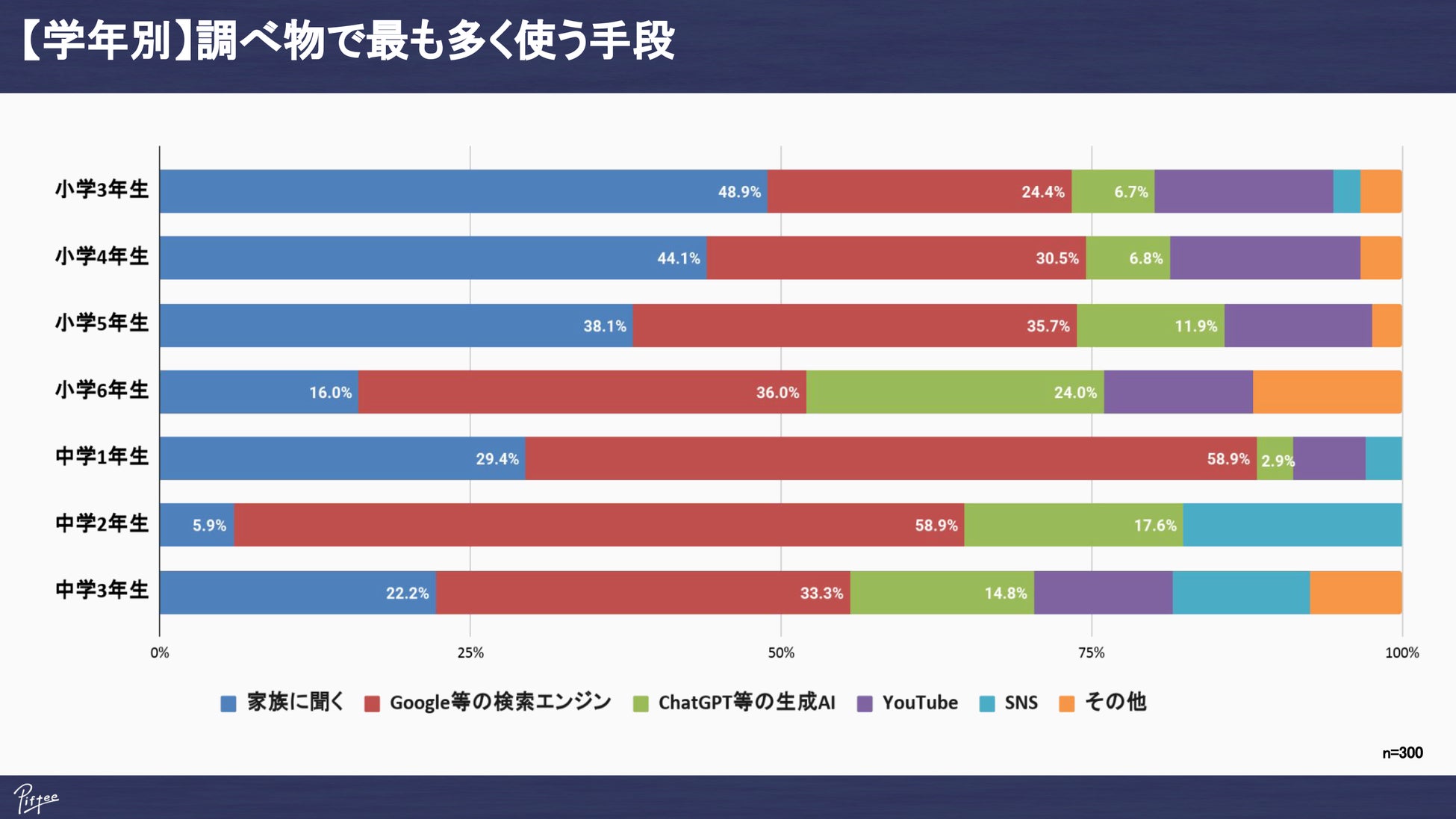 学年別に見ると、小学3年生では「家族に聞く」が48.9%と約半数を占め、Google検索は24.4%にとどまります。一方、中学1年生になるとGoogle検索が58.8%に急伸し、「家族に聞く」は29.4%に減少します。