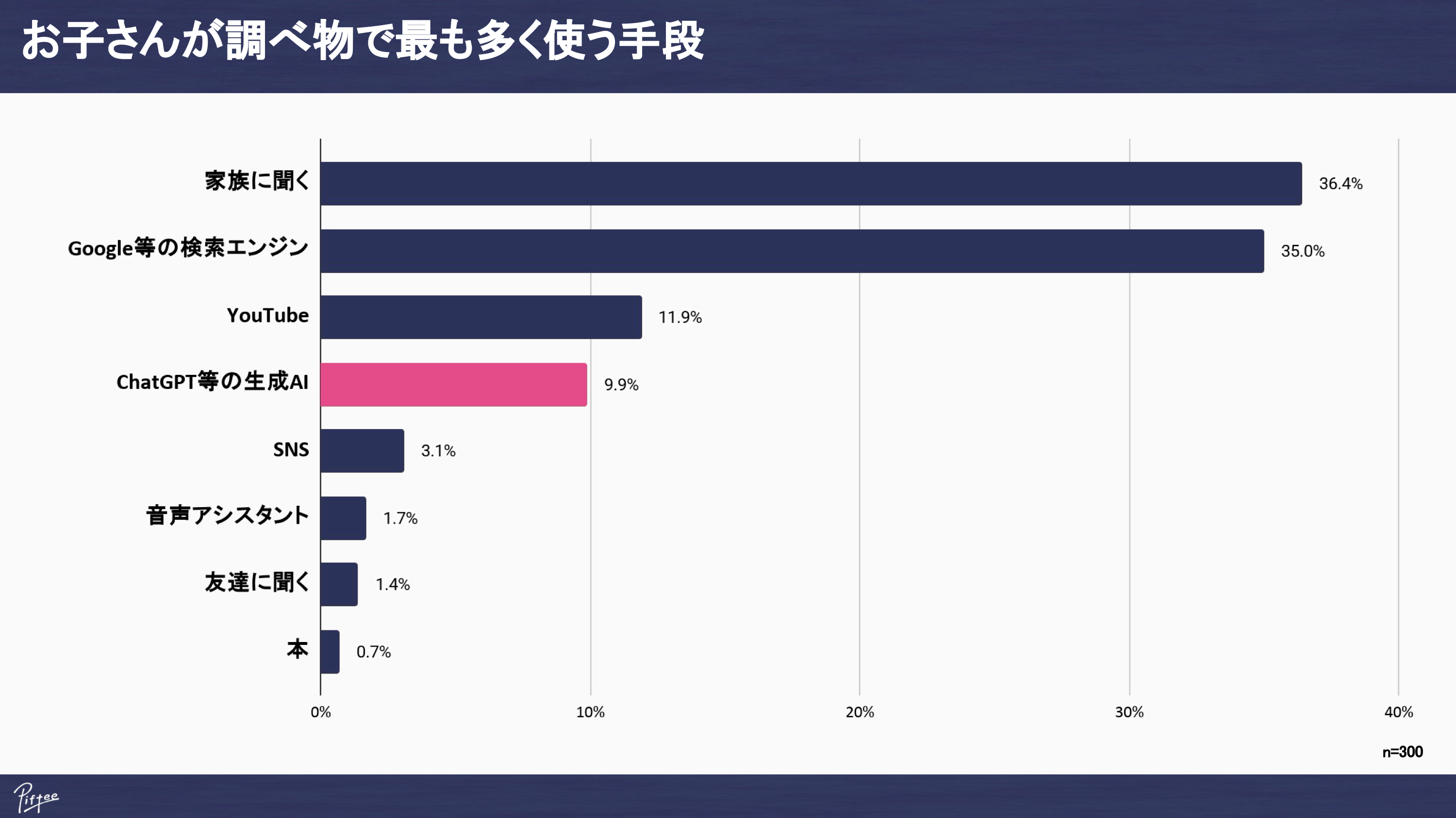 「お子さんが何か知りたいことがある時、最も多く使う手段は?」という問いに対し、「家族に聞く」が36.4%で最多となり、次いで「Google等の検索エンジン」が35.0%でほぼ同率でした。