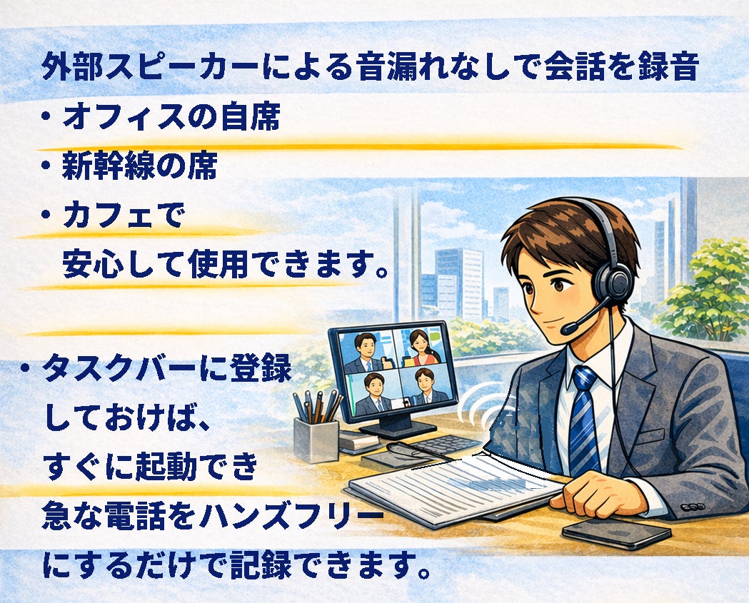 ※ICレコーダー・ボイスレコーダーアプリは外部スピーカーからの音声を録音します。周りに会話を聞かせたくないヘッドセット着用時は会話を録音できません。この課題を解決しました。