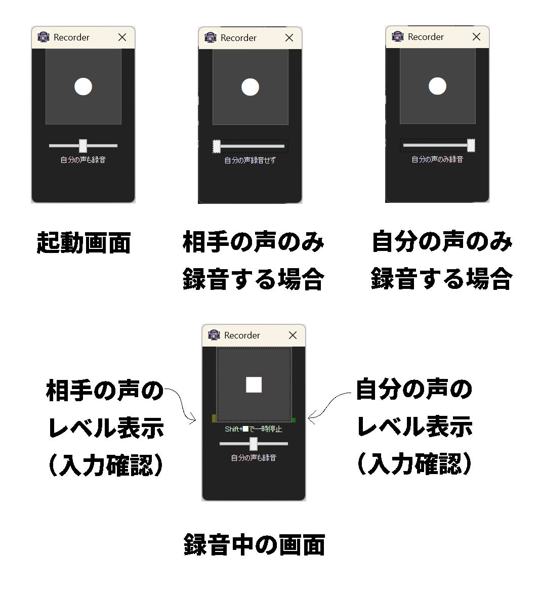 録音モードは「両者の声」「相手の声のみ」「自分の声のみ」の3通りから選択可能です。
