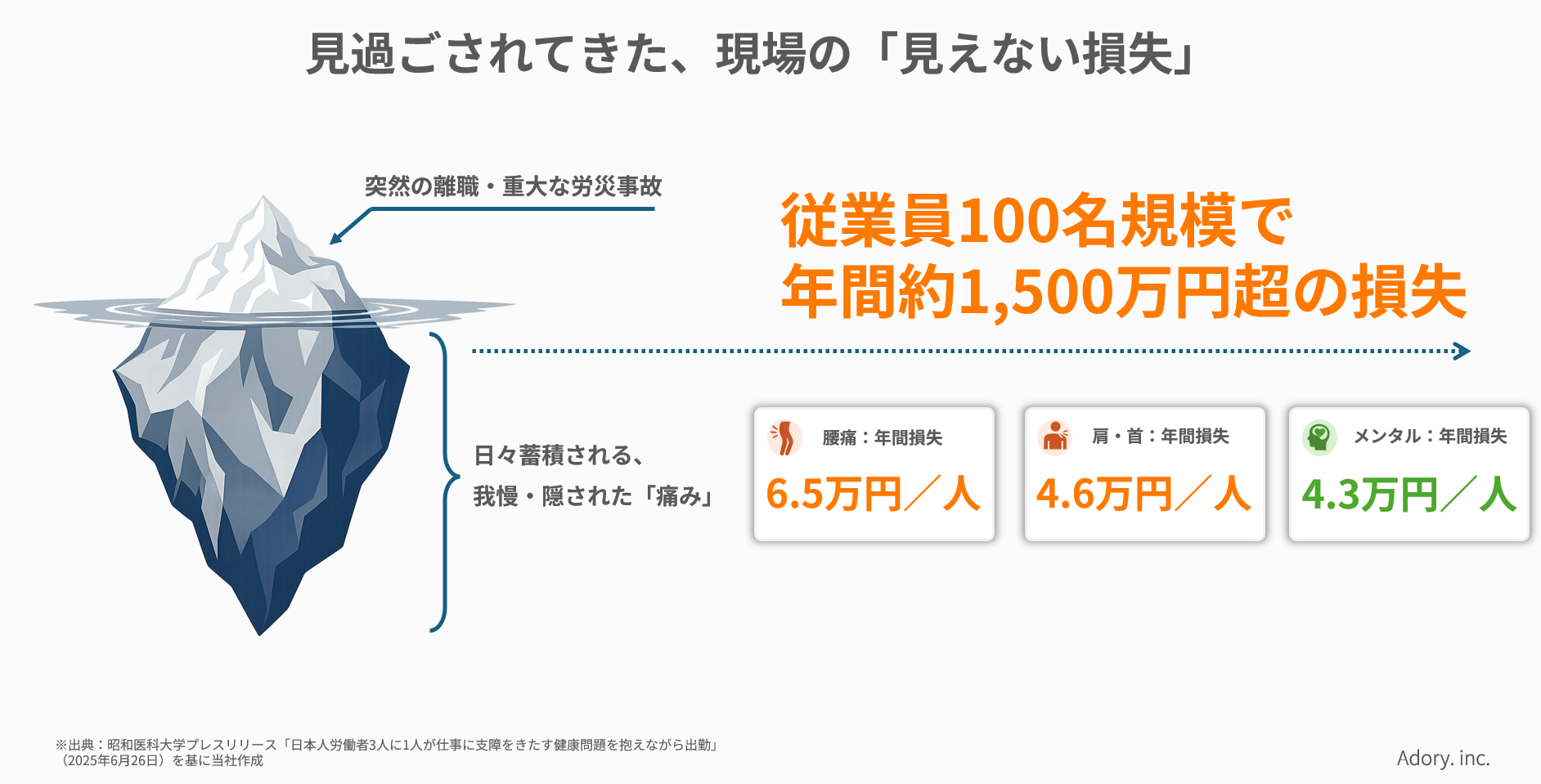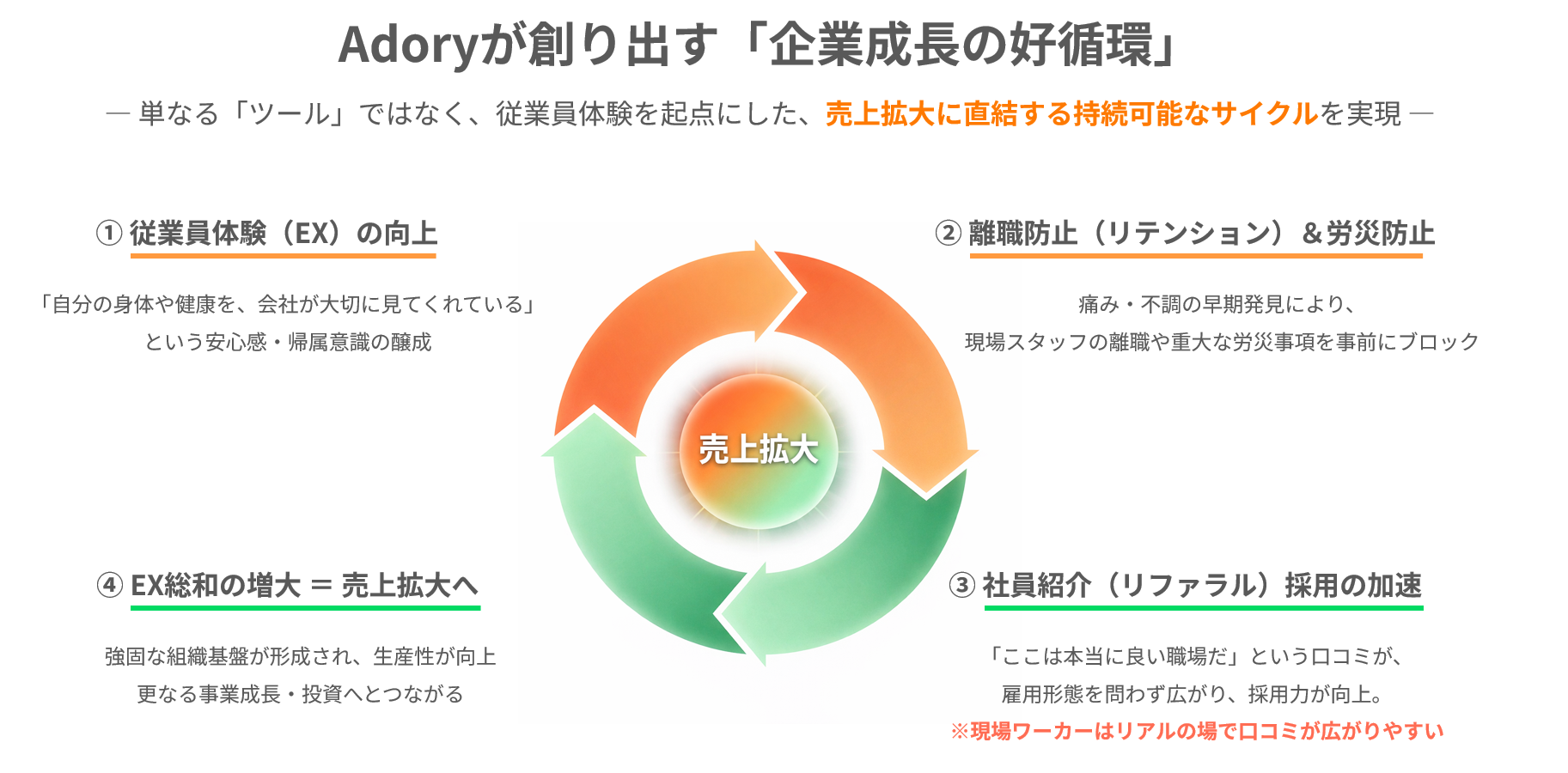 Adoryは、この身体の痛みが「個人責任」とされる文化を変え、身体のコンディションを企業の“重要な経営資本”として捉え、管理する世界を目指しています。