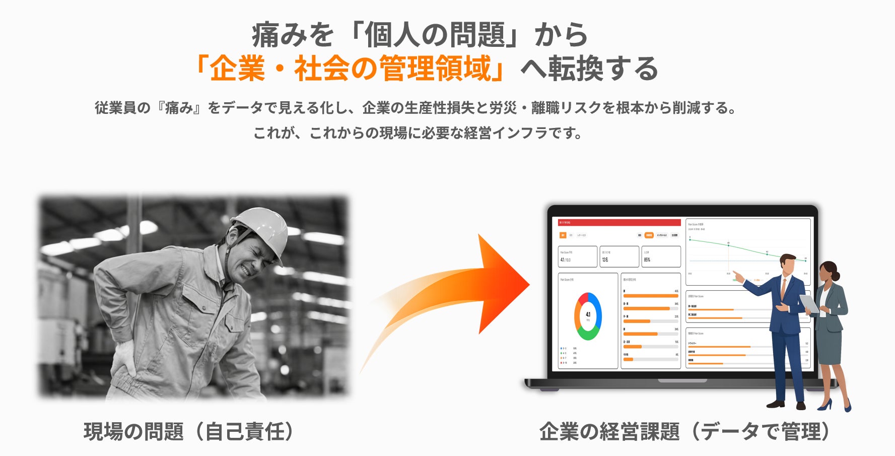 従業員の「痛み」やコンディションデータを可視化することで、企業の生産性損失や労災・離職リスクを構造的に減らす。