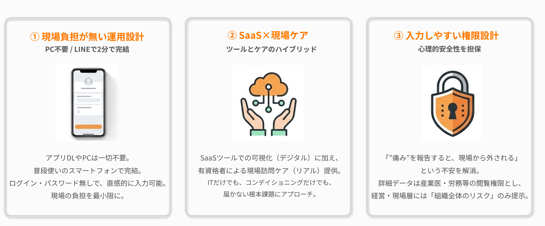 病院に行く前の“早期発見装置”として、デジタル(SaaS)による可視化を通じて現場の身体状態を把握し、企業が適切な対策を取れる環境を整備します。