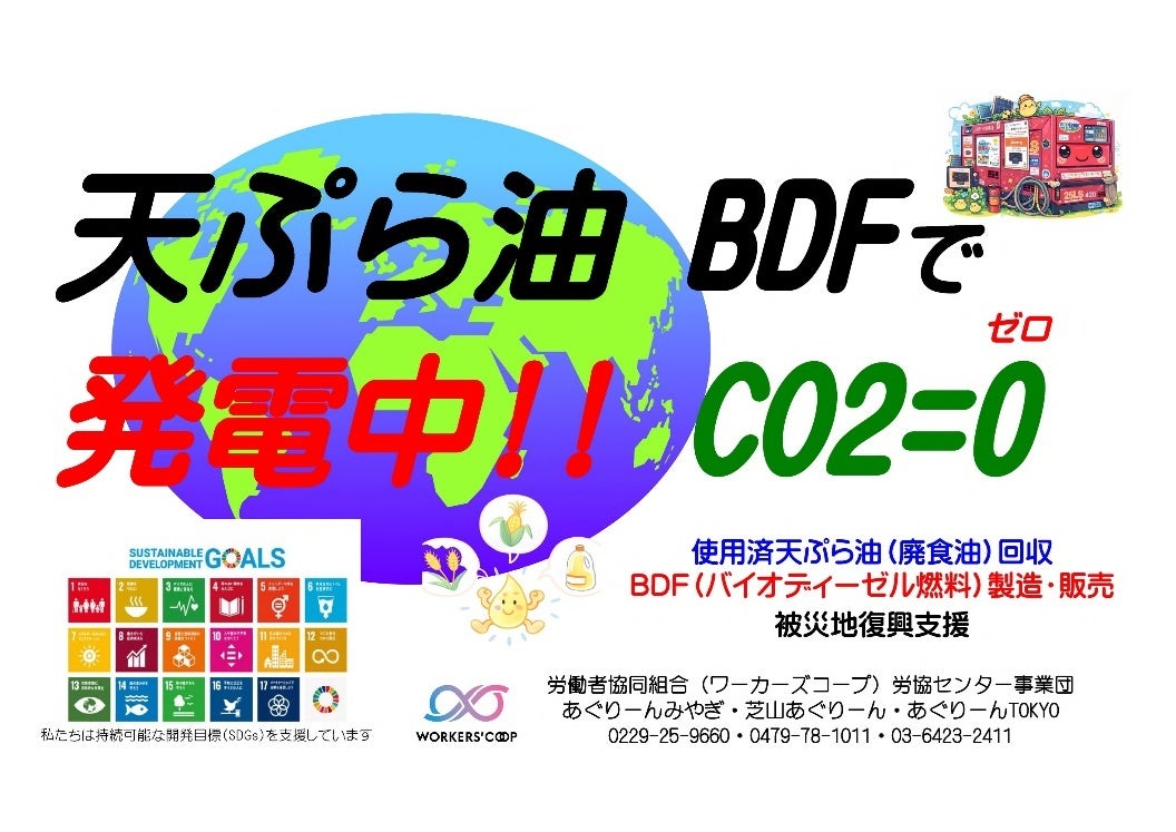 また、パリ協定より以前の2010年から、できるだけ地域でエネルギーを自給しようと組織内外に呼びかけ、家庭や飲食店から廃棄される「使用済みてんぷら油」を回収し、環境負荷の低い「バイオディーゼル燃料(以下 BDF燃料)」を製造し、地球への負荷が小さく、身近な資源をエネルギーとして循環させる取り組みを始めています。