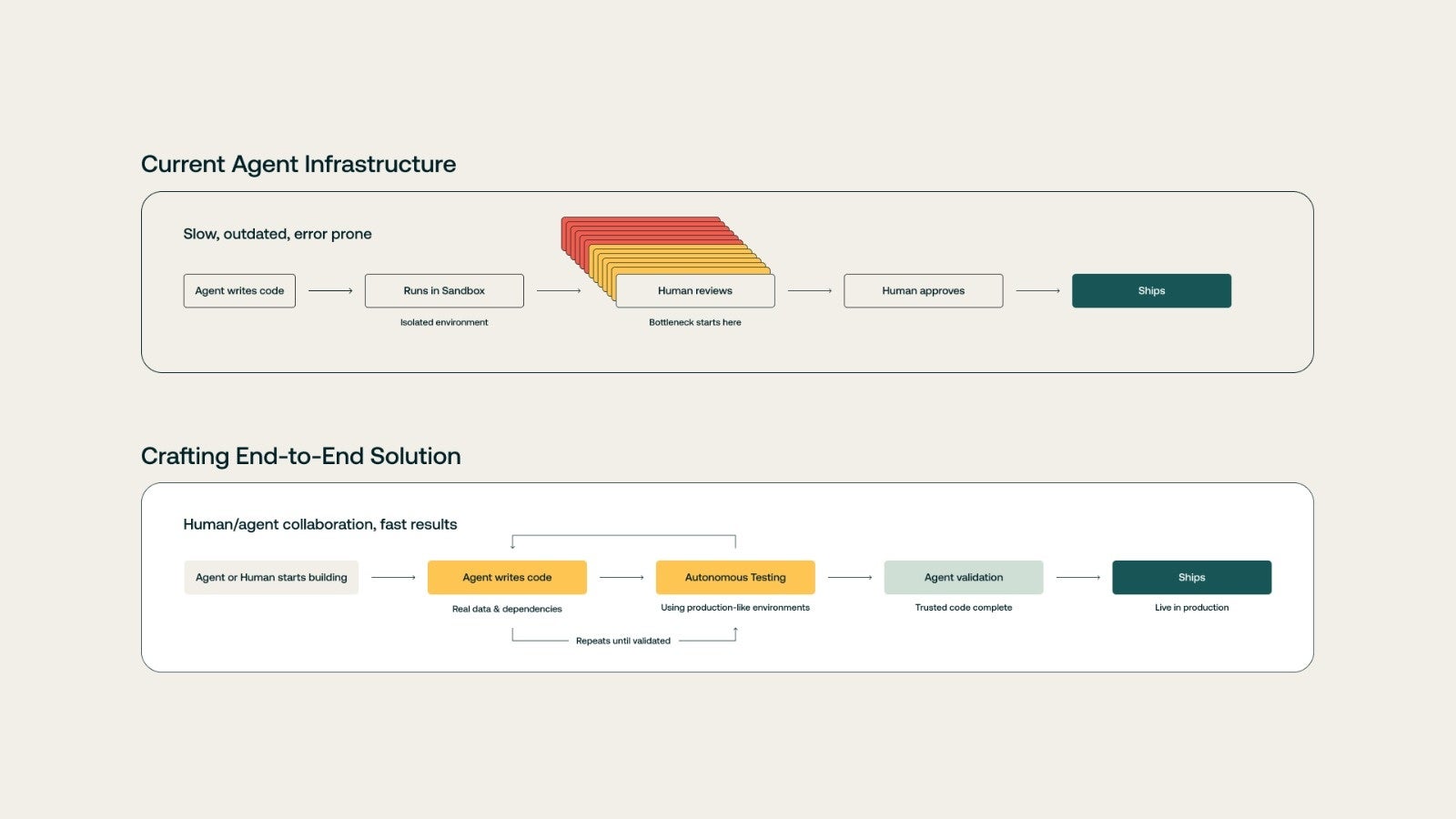 しかし、AIエージェントがプルリクエストを作成し、本番コードを書くようになっても、その内容を検証するためのインフラが追いついていません。エンタープライズのシステムはあまりに複雑でサンドボックス環境だけでは再現しきれず、最終的な確認や検証の段階でエンジニアがボトルネックになっているのが現状です。