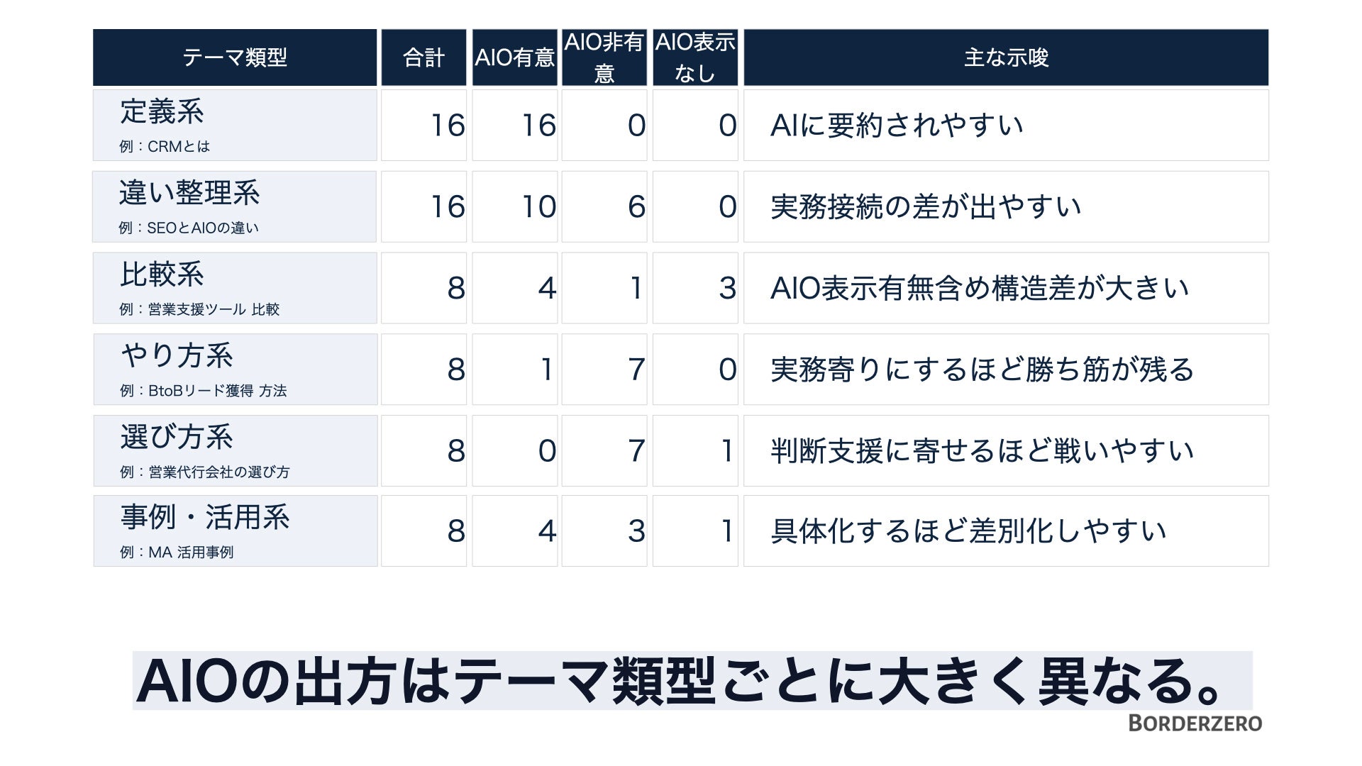 BorderZeroが2026年4月に実施したBtoBテーマ中心の64クエリ調査では、AIOの出方や優先的に対策すべきテーマは、テーマ類型ごとに大きく異なることが分かりました。