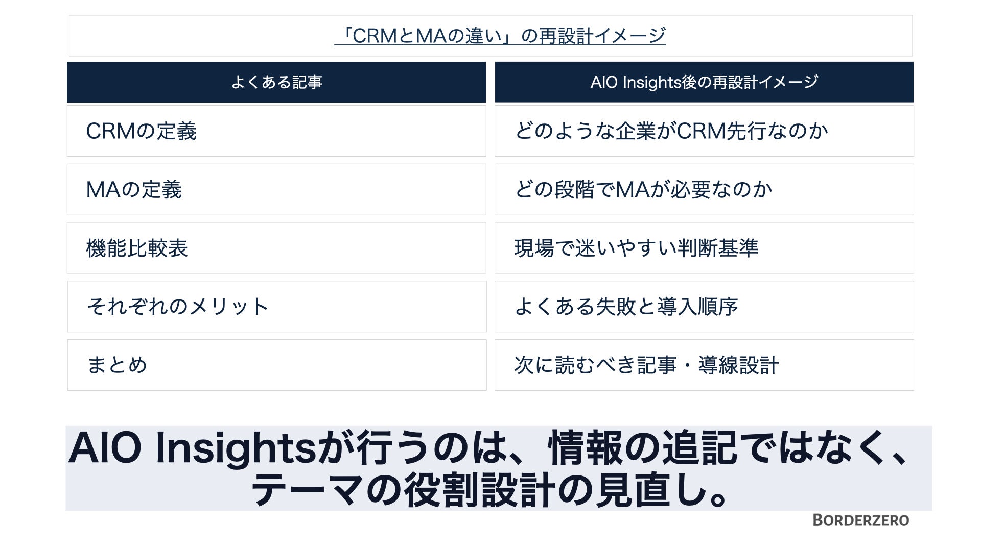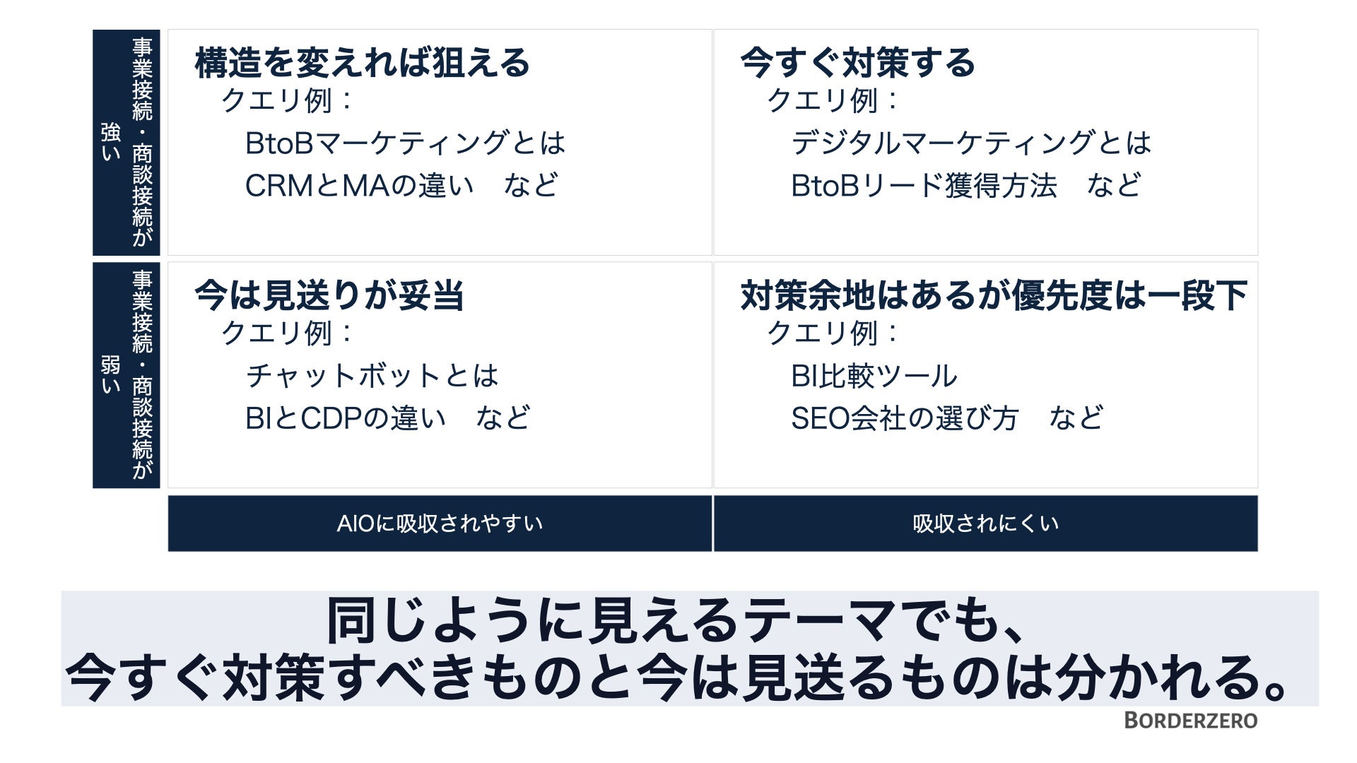 この結果から、AIO時代のコンテンツ改善では、単に「よくある記事」を増やすのではなく、どのテーマがAIに吸収されやすく、どのテーマなら事業成果につながる形で再設計できるかを見極めることが重要だとBorderZeroは考えています。