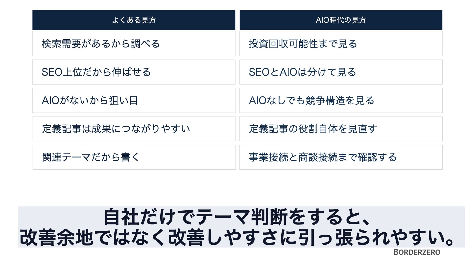 実際には、同じように見えるテーマでも、事業接続性や商談接続性、AIOに吸収されやすいかどうかによって、今すぐ対策すべきものと今は見送るものが分かれます。