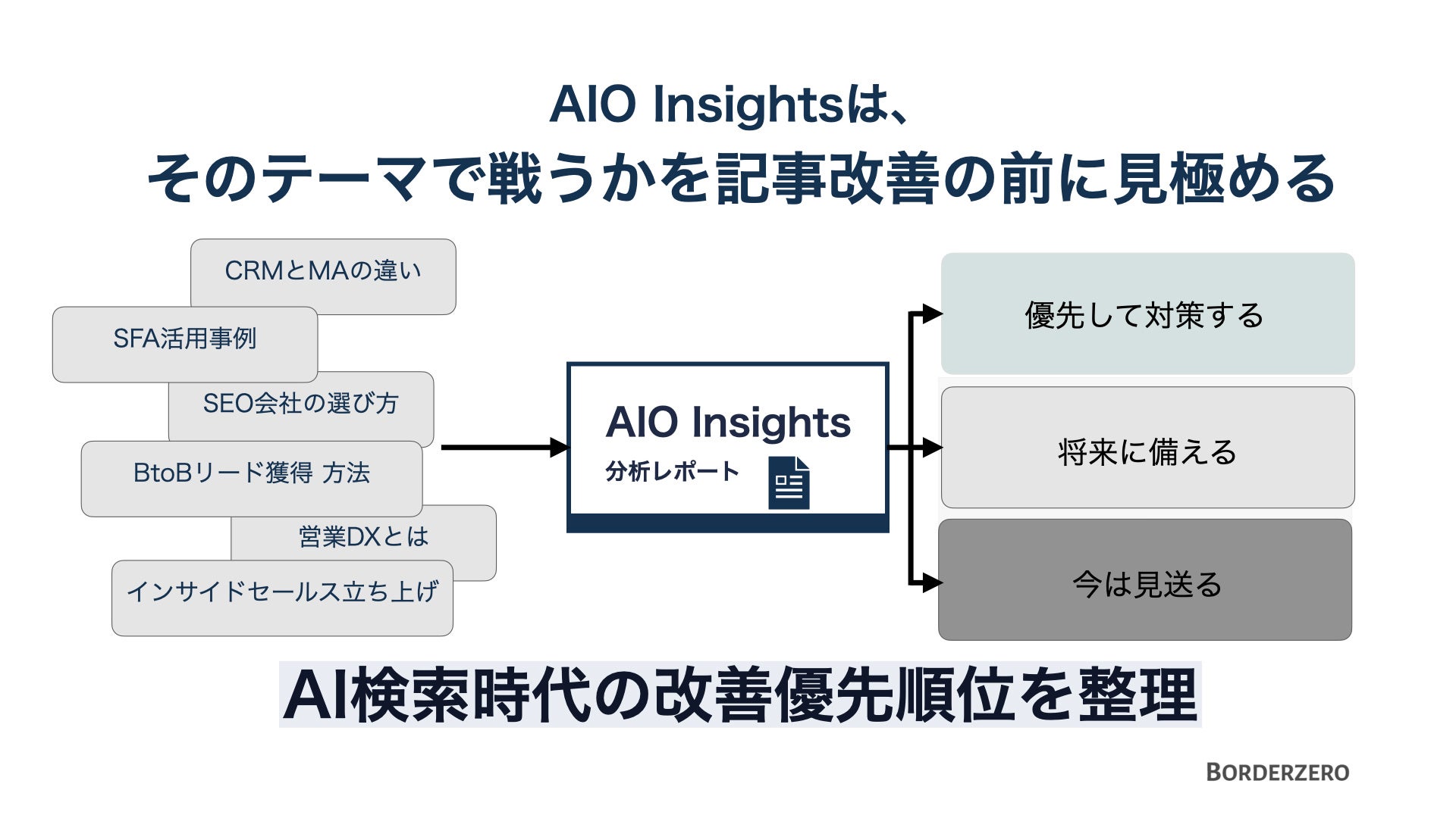 BorderZeroは、この変化に対応するため、コンテンツ改善を「何を直すか」の議論から、「どのテーマを今すぐ優先的に見直すか」の意思決定へ引き上げる必要があると考え、AIO Insightsを開発しました。