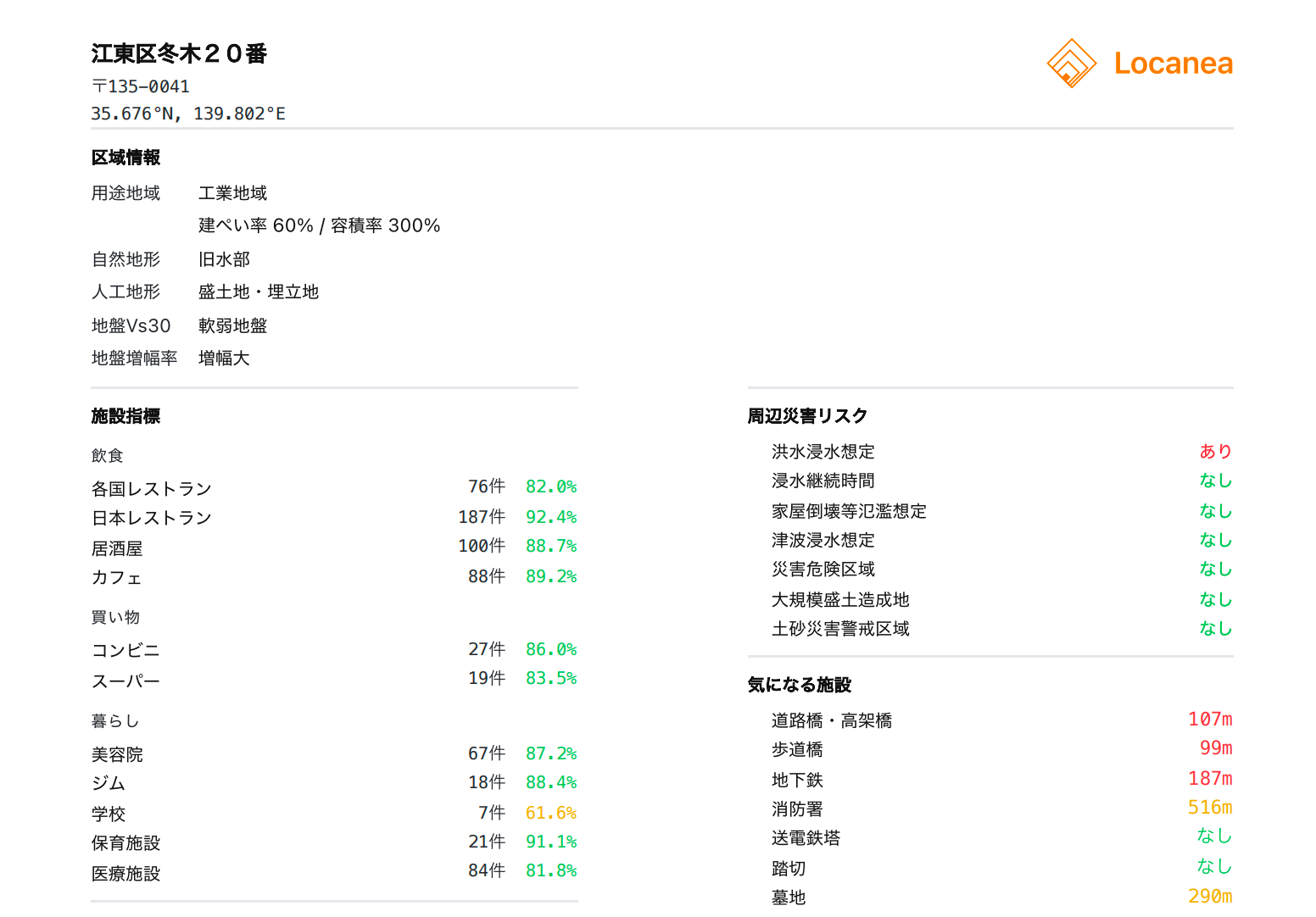 首都圏(東京都・神奈川県・千葉県・埼玉県)を対象に、165万点以上の施設データと137のGIS図層をブラウザ上で即座に可視化。任意の地点に対して51項目の立地指標を100ミリ秒以下で算出し、不動産仲介の物件紹介資料、飲食・小売の出店分析、法人の用地選定に、データに基づく意思決定の基盤を提供します。