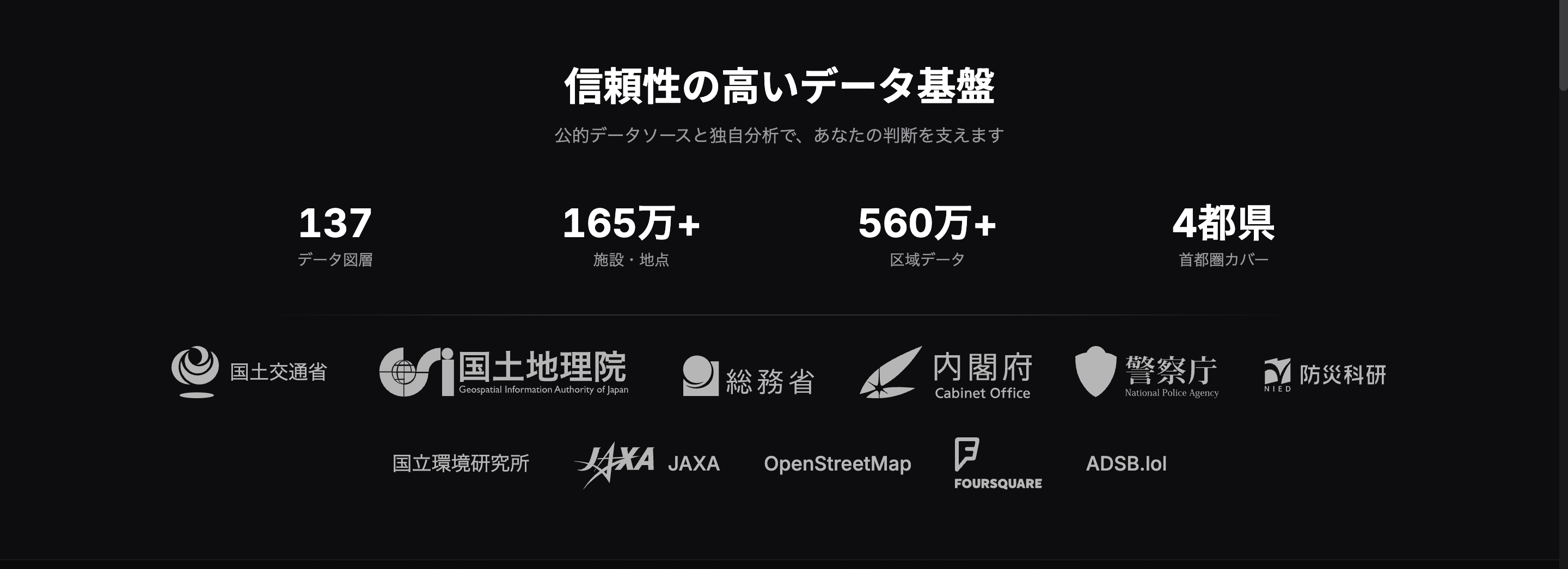 国土交通省(国土数値情報・不動産情報ライブラリ・都市計画決定情報GIS)/ 総務省統計局(e-Stat 国勢調査・経済センサス)/ 国土地理院(基盤地図情報)/ 防災科学技術研究所(J-SHIS 地震ハザードステーション)/ JAXA(GCOM-C 衛星観測データ)/ 国立環境研究所(大気環境データ)/ 内閣府(中央防災会議)/ 警察庁(交通事故統計)/ OpenStreetMap / Foursquare / ADSB.lol