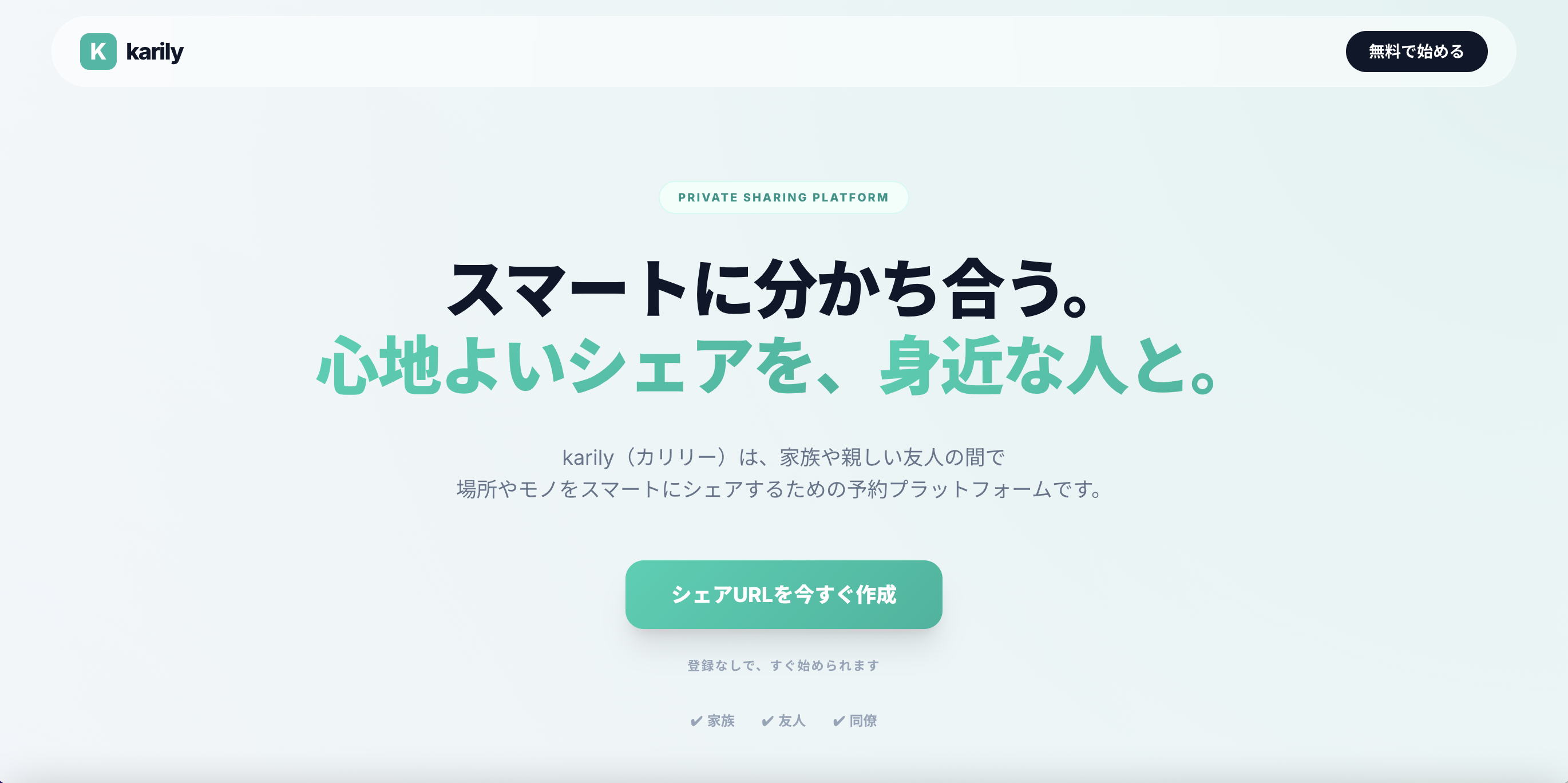 家族や友人との場所やモノの利用予約を、共有URLひとつで管理できるシェアプラットフォーム「karily(カリリー)」が、2026年2月25日に公開されました。