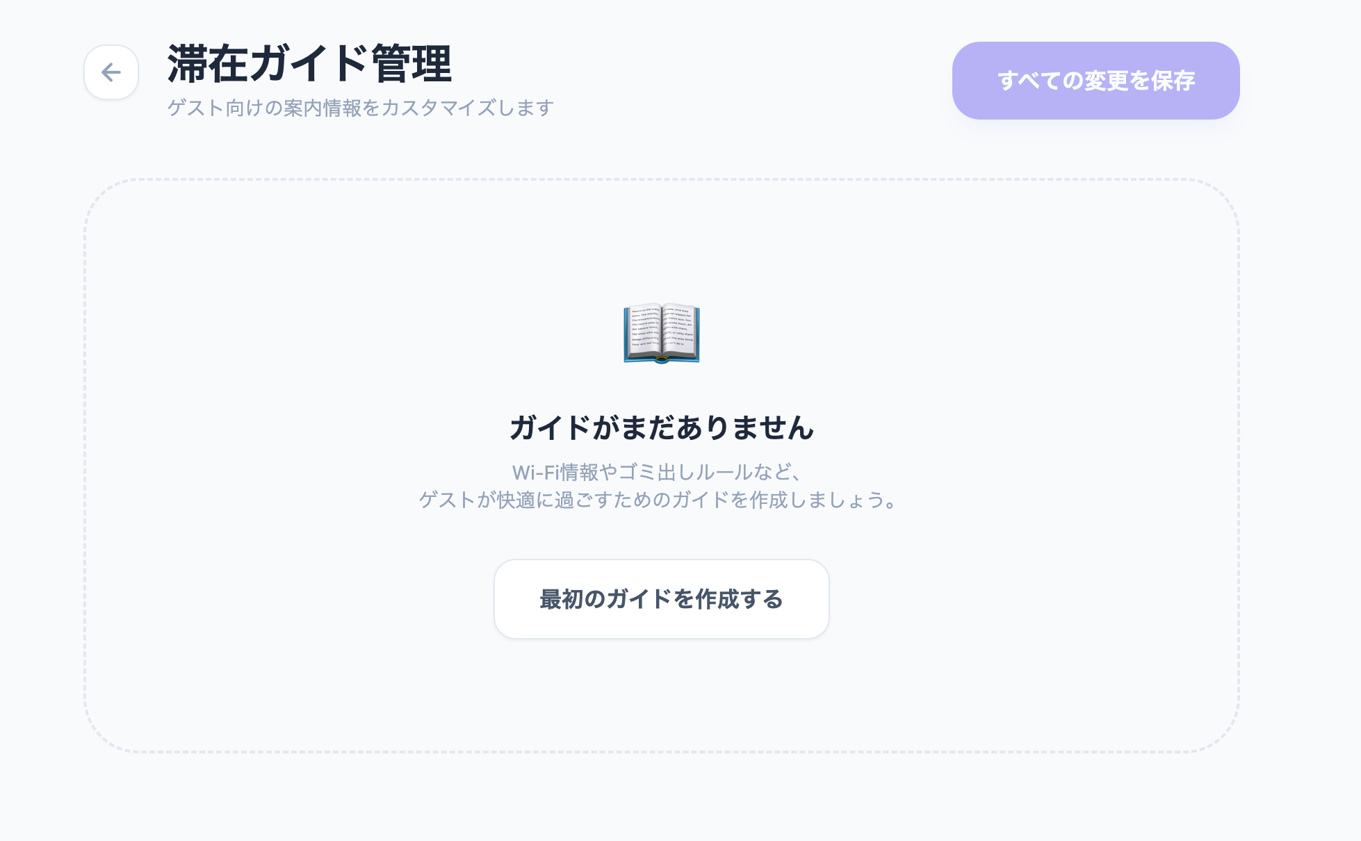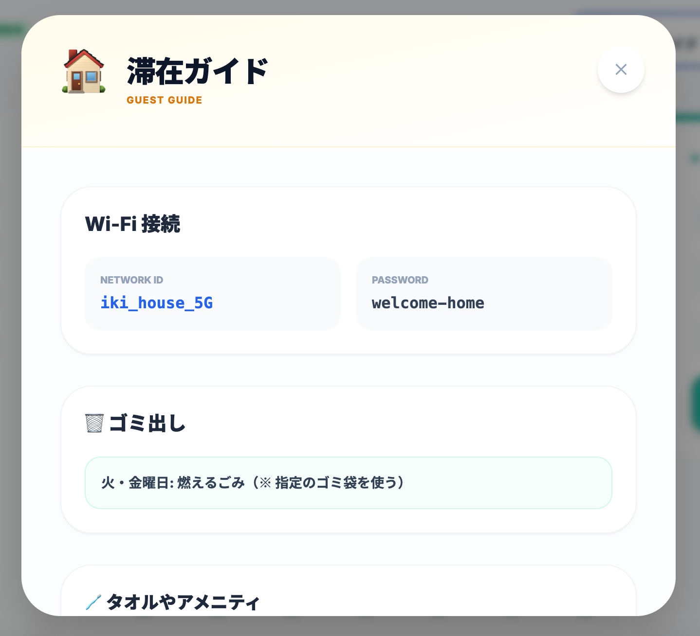 無線LANのパスワード、鍵の場所、ゴミ出しルールなど、利用時に必要な情報をガイドにまとめて共有できます。
