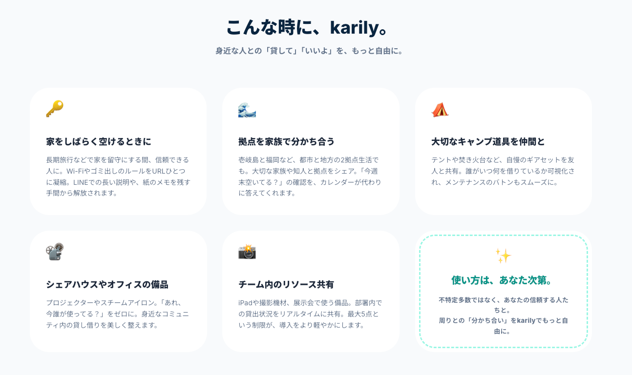 堅苦しい手続きや管理ではなく、身近な人同士の軽やかな貸し借りを支える仕組みとして、karilyは生まれました。