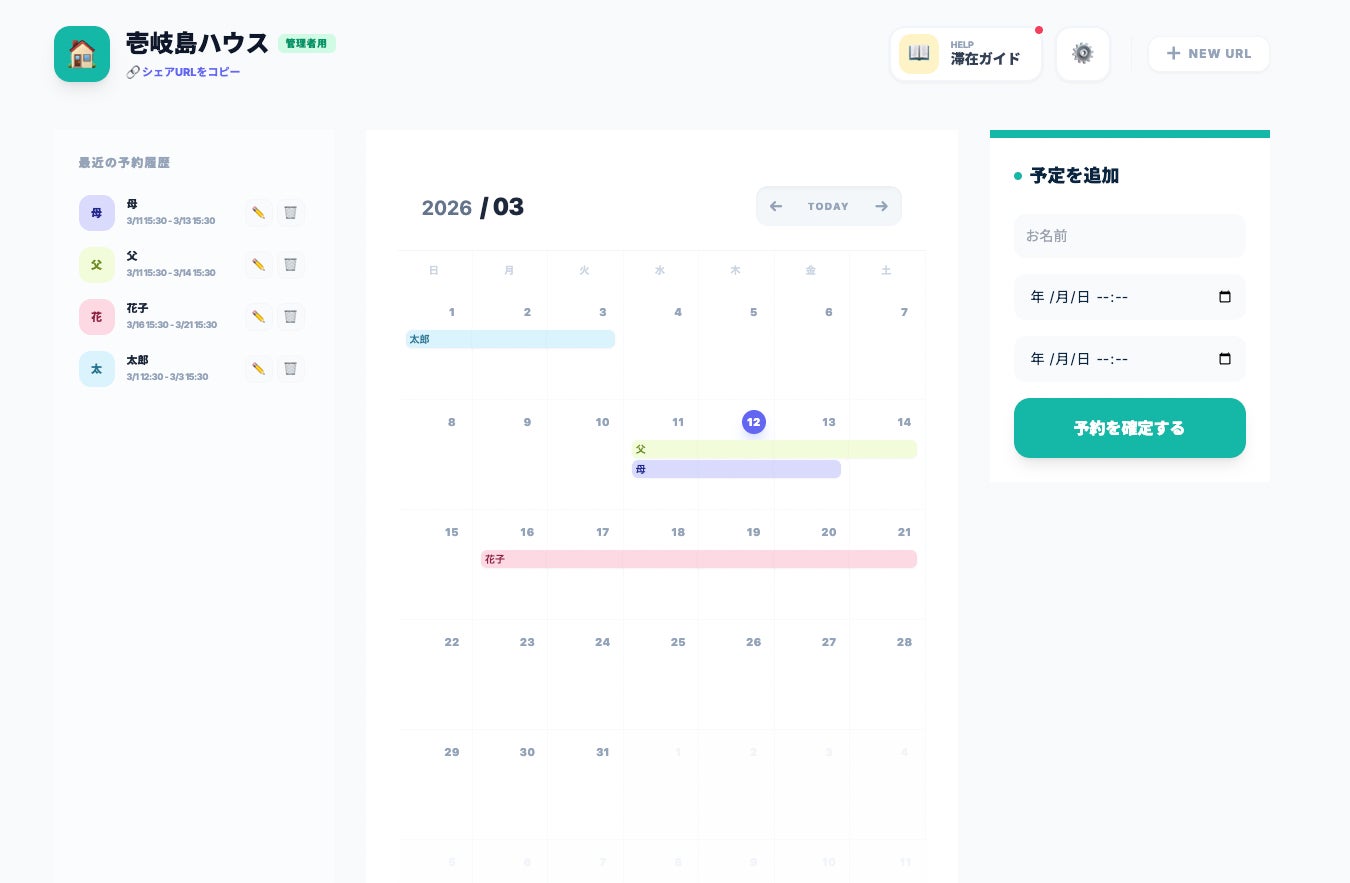 URLを共有するだけで空き状況の確認や予約管理ができ、家族・友人コミュニティ内でのシェアをシンプルに管理できます。