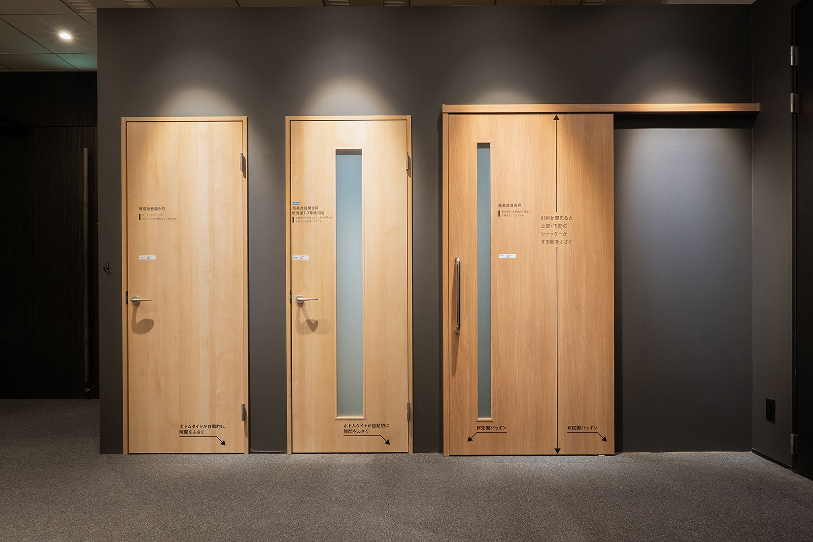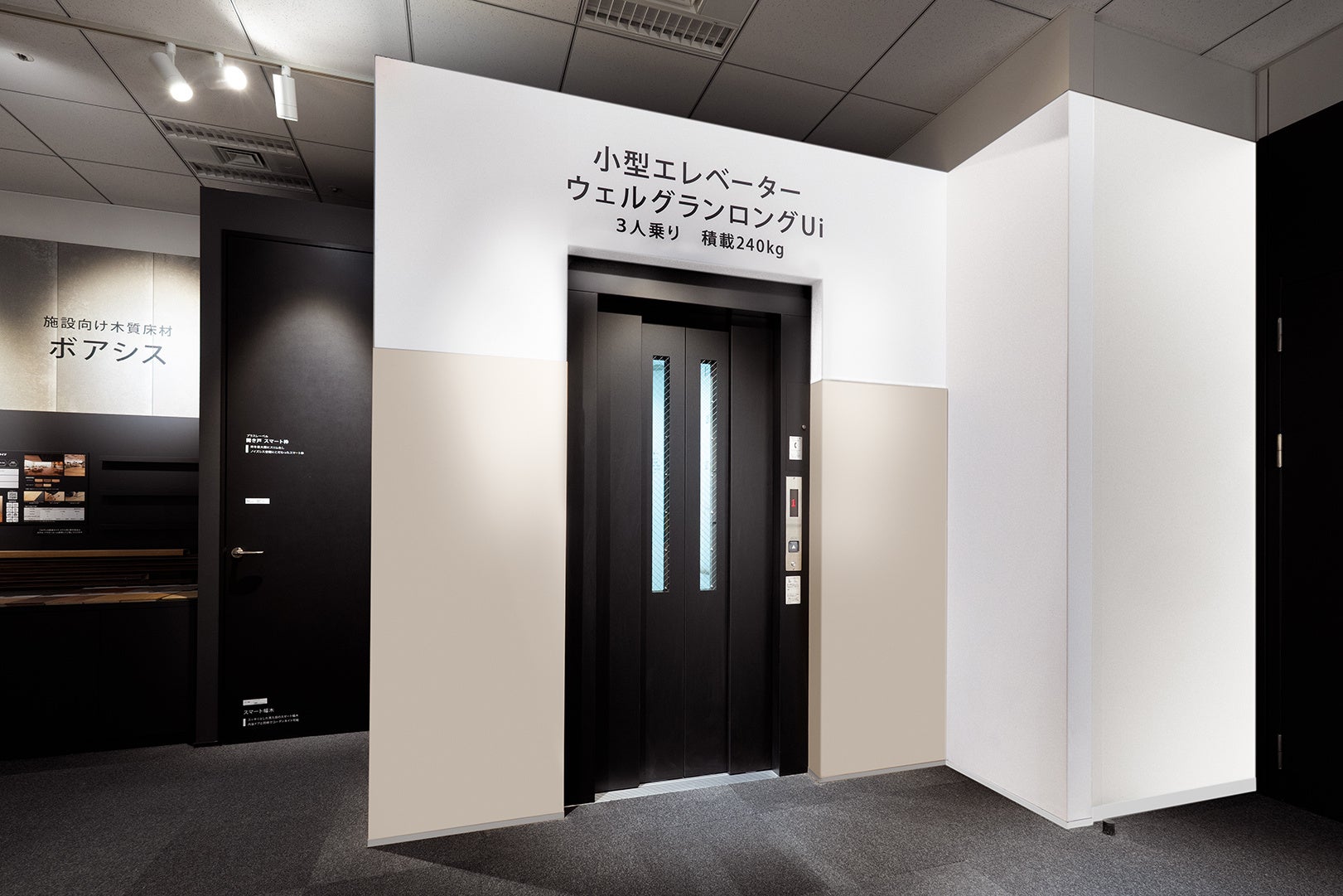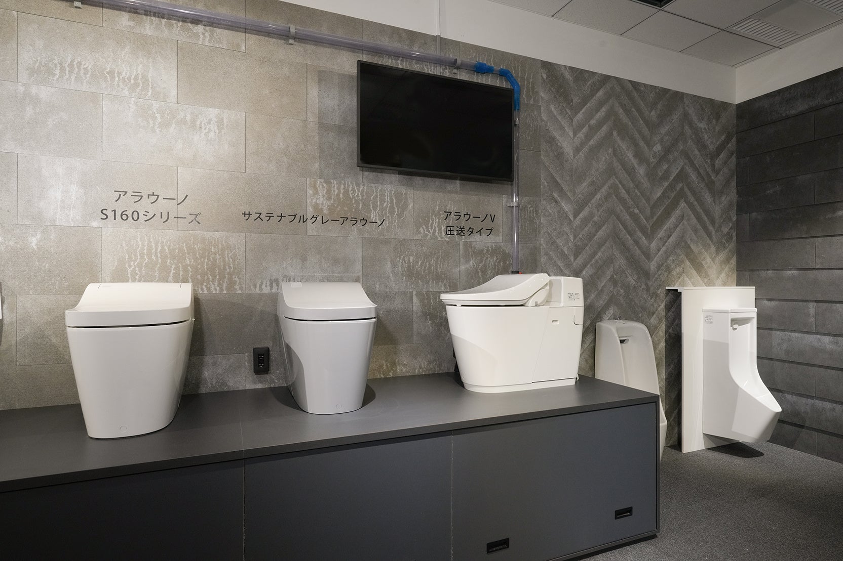 当スタジオ内では、当社が提案する施設向け製品の技術展示を実施しています。アラウーノV圧送タイプには配水管を接続し、圧送能力をその場で確認することが可能です。また、不燃軽量天井材「エアリライト」の軽さを引き出す断面構造や、高齢者向けユニットバス「アクアハートシリーズ」における浴室内段差0 mm(高低差3 mm)については、車椅子を使用して体感できます。そのほか、アラウーノ小便器と陶器製品との重量比較、衝撃吸収フロアー「クラウドステージ」と通常の床材との衝撃吸収性の比較、さらには遮音性能が求められる病院やクリニックなどの診察室に適した「簡易遮音引戸」の遮音体験も可能です。